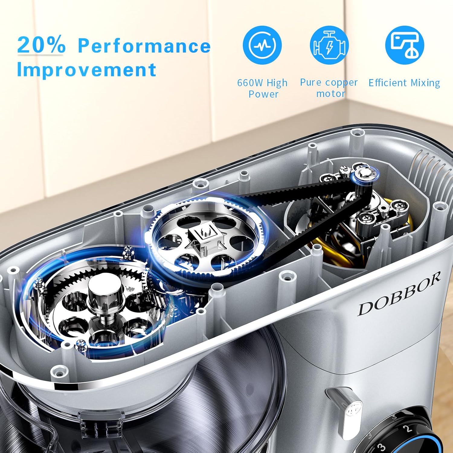 - 🍪【Reliable Quality & Dishwater Safe】-DOBBOR standing mixer has been approved with FCC, ROSH, and other certifications. The overheating protection function of the cake electric mixer can make you feel at ease when baking. Clean-up is simple with a kitchen mixer, As for the bowls and attachments you can either wash them in the sink or safely put them in the dishwasher.