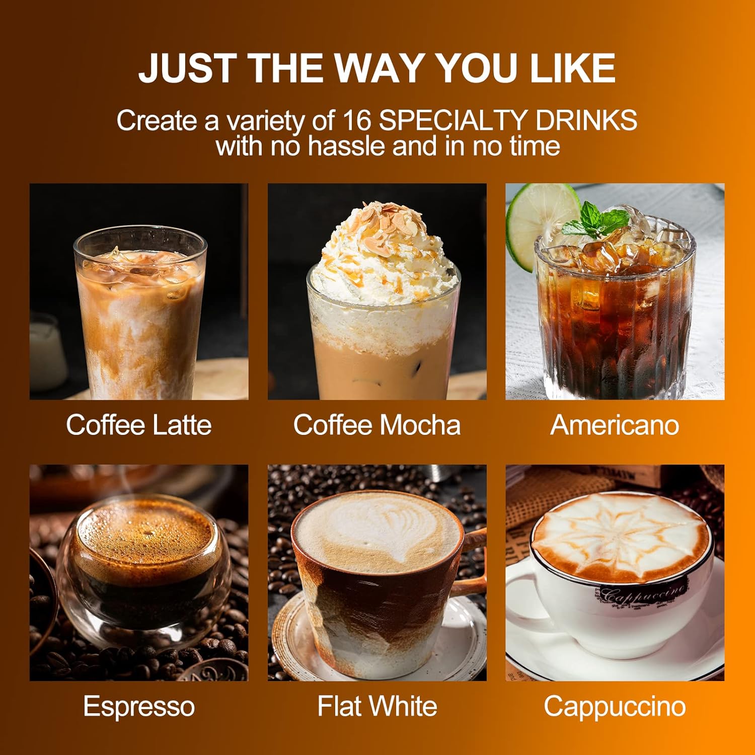 - ☕ Touch Screen: The touch screen display simplifies how to make your favorite coffee in 3 easy steps: Grind, Brew and Milk; Easily adjust the coffee strength, milk texture and temperature to suit your taste.16 kinds of coffee,each coffee all can adjust the water content, milk content, coffee concentration.