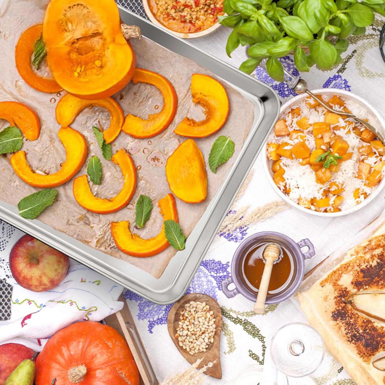 - 【SET OF 4】 Both trays 16 x 12 x 1 inch, Perfect for baking or roasting, Easy to make cookie, vegetables and meat, Also can be a serving pan and fruit container, Getting 4 piece baking pans is perfect to serve different purpose at the same time