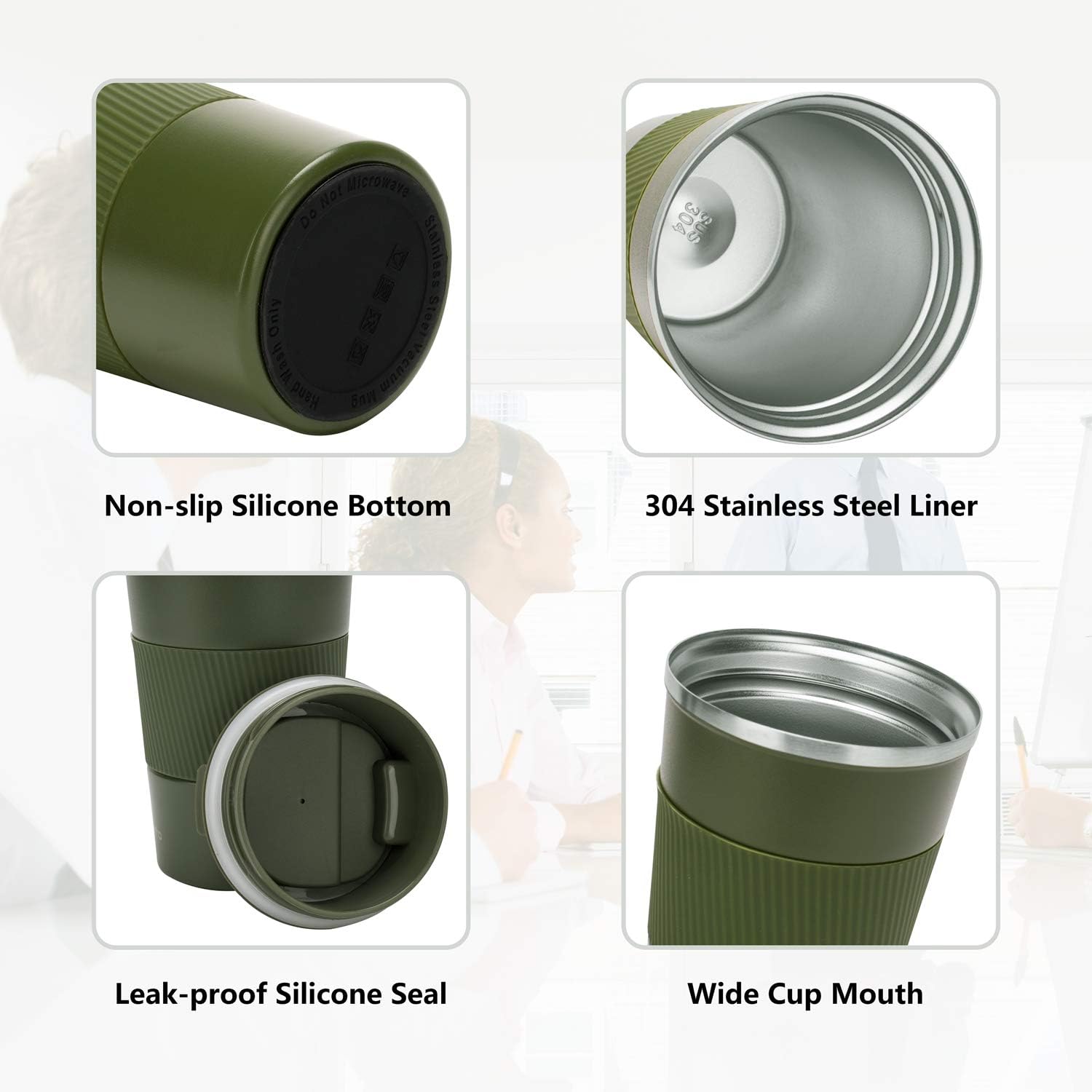- 【Insulated Coffee Travel Mug with Lid】The insulated travel coffee mug designed with leak proof flip lid for easy sipping at any time, the screw lid equipped with a airtight silicone ring on the lid, provides a good leak-proof effect, securely fastens to the coffee cup by twisting, helps to prevent leaking or splashing.