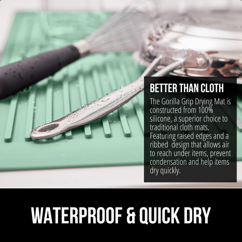 GORILLA GRIP 100% BPA-Free Patented Silicone Dish Drying Mat for Kitchen Counter, Water Catching Ribbed Design, Easy Clean Waterproof Sink Liner, Heat Resistant, Fits Under Rack, 16x12 Inch, Mint