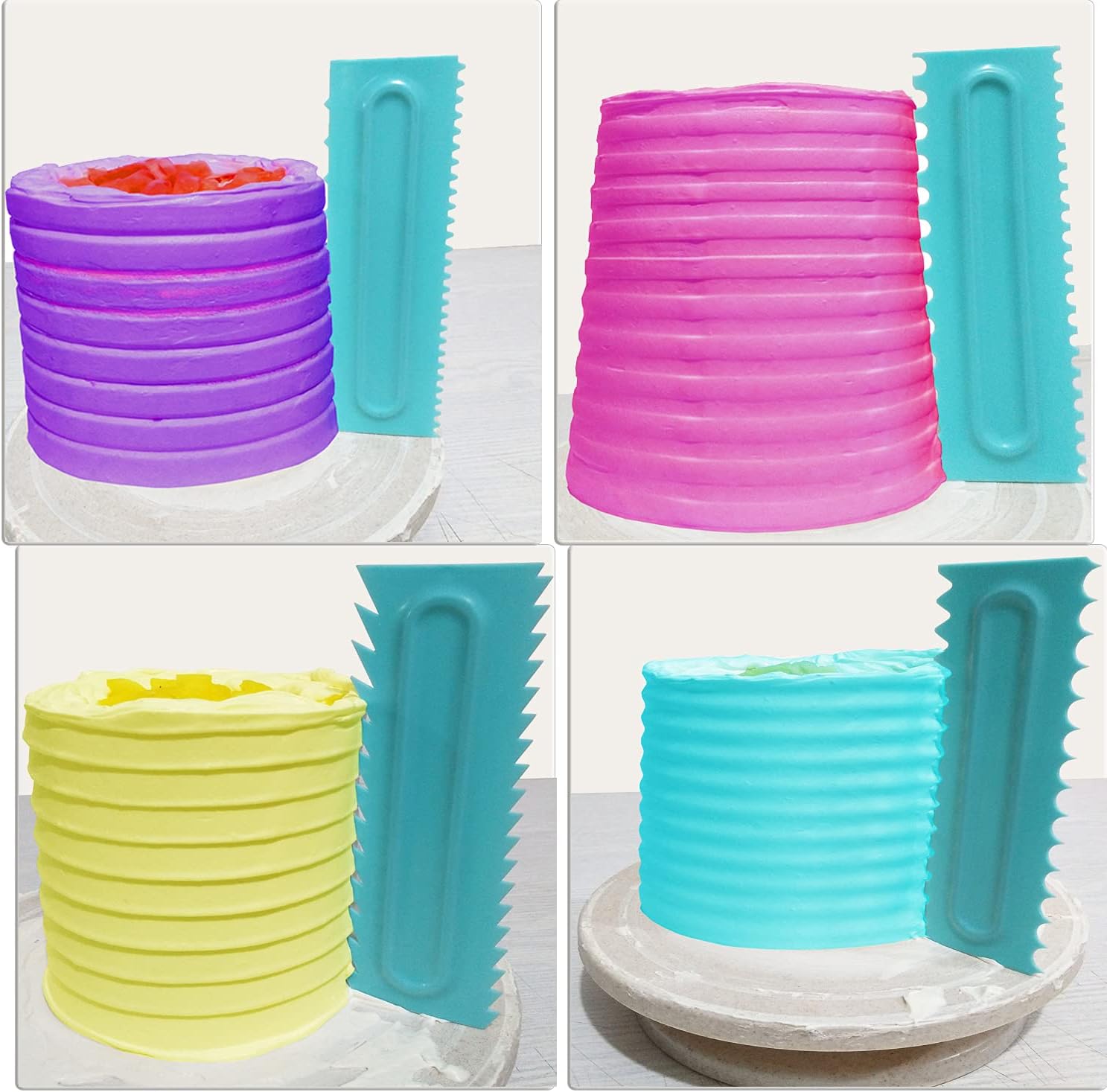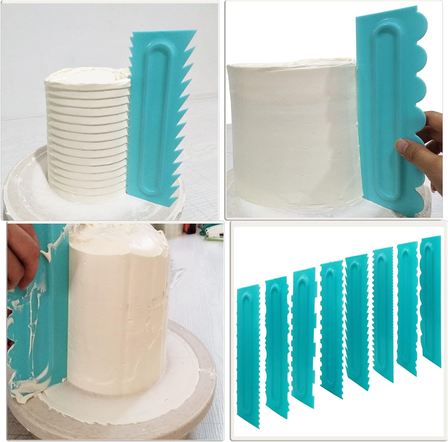 - Different Shapes-8 Pieces in 16 patterns.You will get 8 pieces of cake smoothers in total; Both sides of this cake scraper are available to use and there are 16 patterns including smooth edge for you to create different shapes of cake edges.Easily add different textures and designs to butter cream icing.