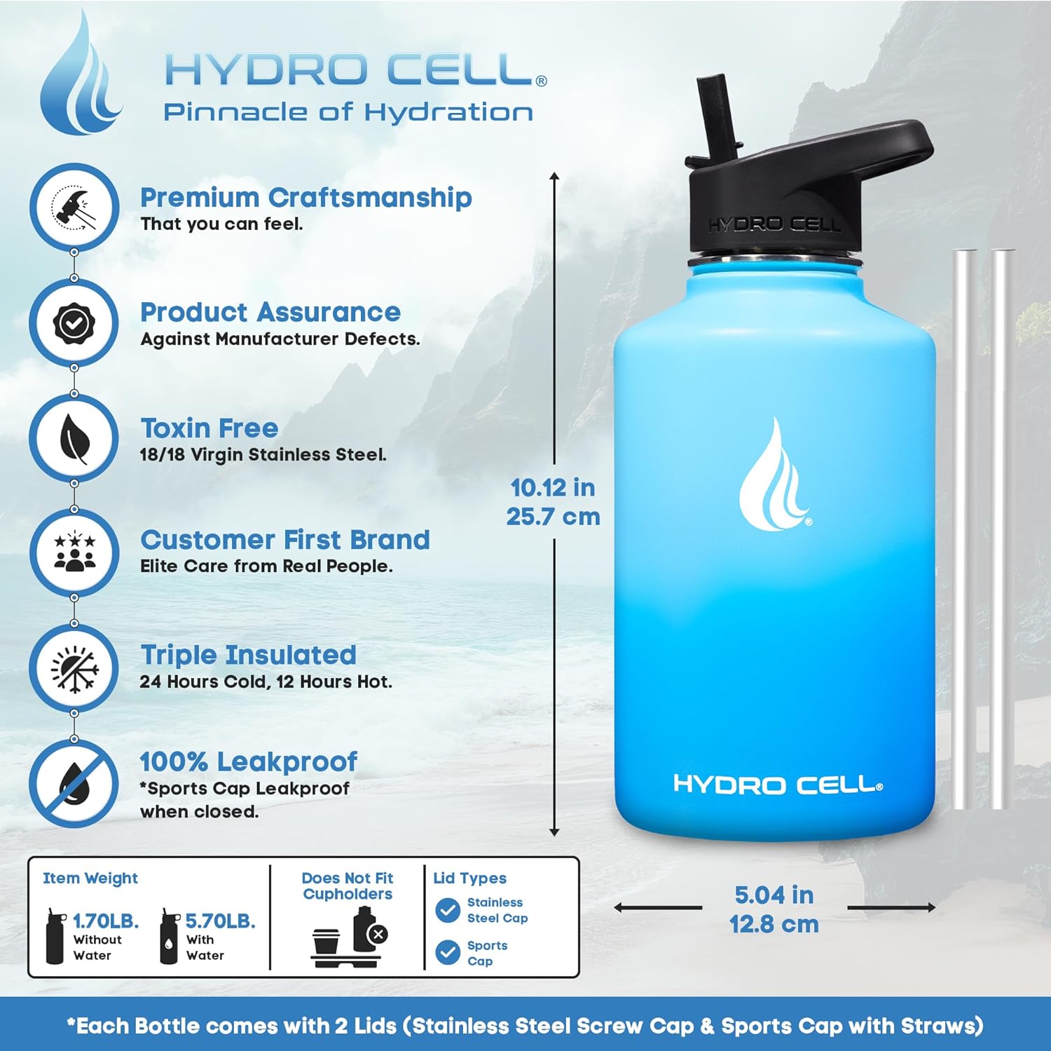 - STYLE: Purchase Includes Stainless Steel Bottle, Screw Cap (100% Airtight), Bonus Sports Cap with Straws (Cold Temp ONLY). Hydro Cell offers the largest selection of matching Paracord Handles, Bottle Boots, and Color Replacement Caps: Sold Separate, Linked Below. Customize your Hydro.
