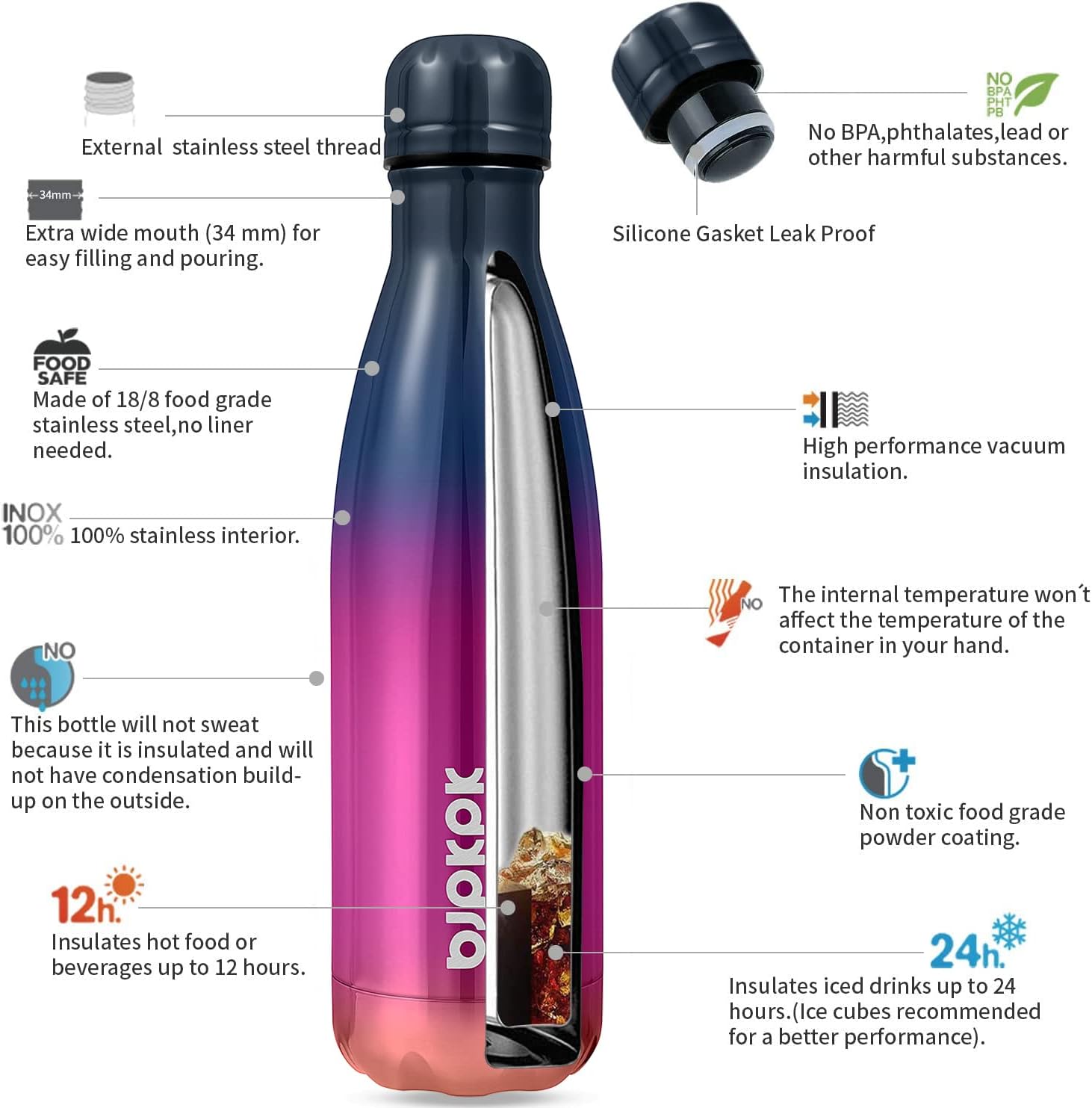 - Keep Drinks Cold & Hot: Adopt double wall vacuum insulation design, keep your drinks ice cold for 24 hours and hot for 12 hours within our highly performed insulated water bottle