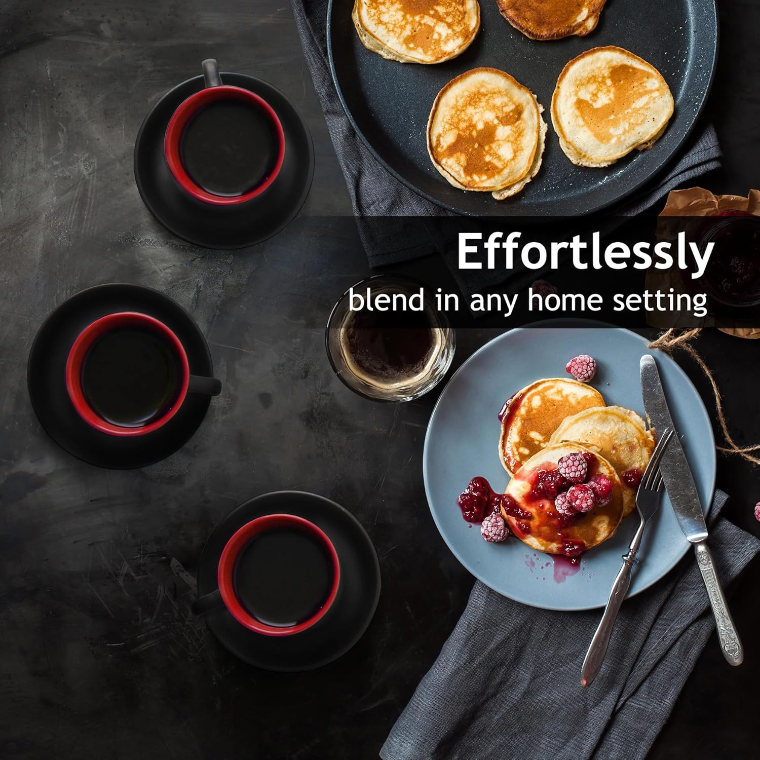 MIAMIO - 2.5 oz Espresso Cup Set with Saucers Coffee Mug Set of 6 - Ceramic Coffee Mug Stackable Espresso Mug with Stand for Coffee Drinks, Latte, Cafe Mocha - Le Papillon Collection (Red)