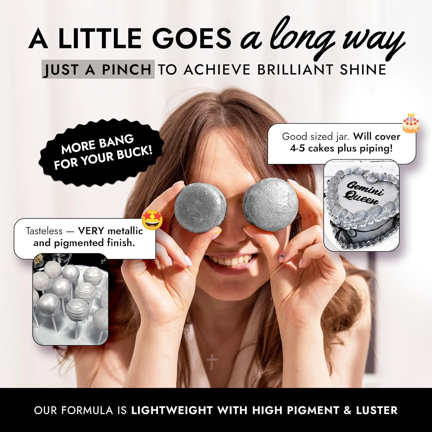 - EASY TO USE: Our silver luster dust is incredibly versatile. Apply with a wet brush, airbrush, or dry brush, and even mix into beverages. Achieve professional-looking results effortlessly at home, whether decorating halloween cakes or adding shimmer to cocktails.