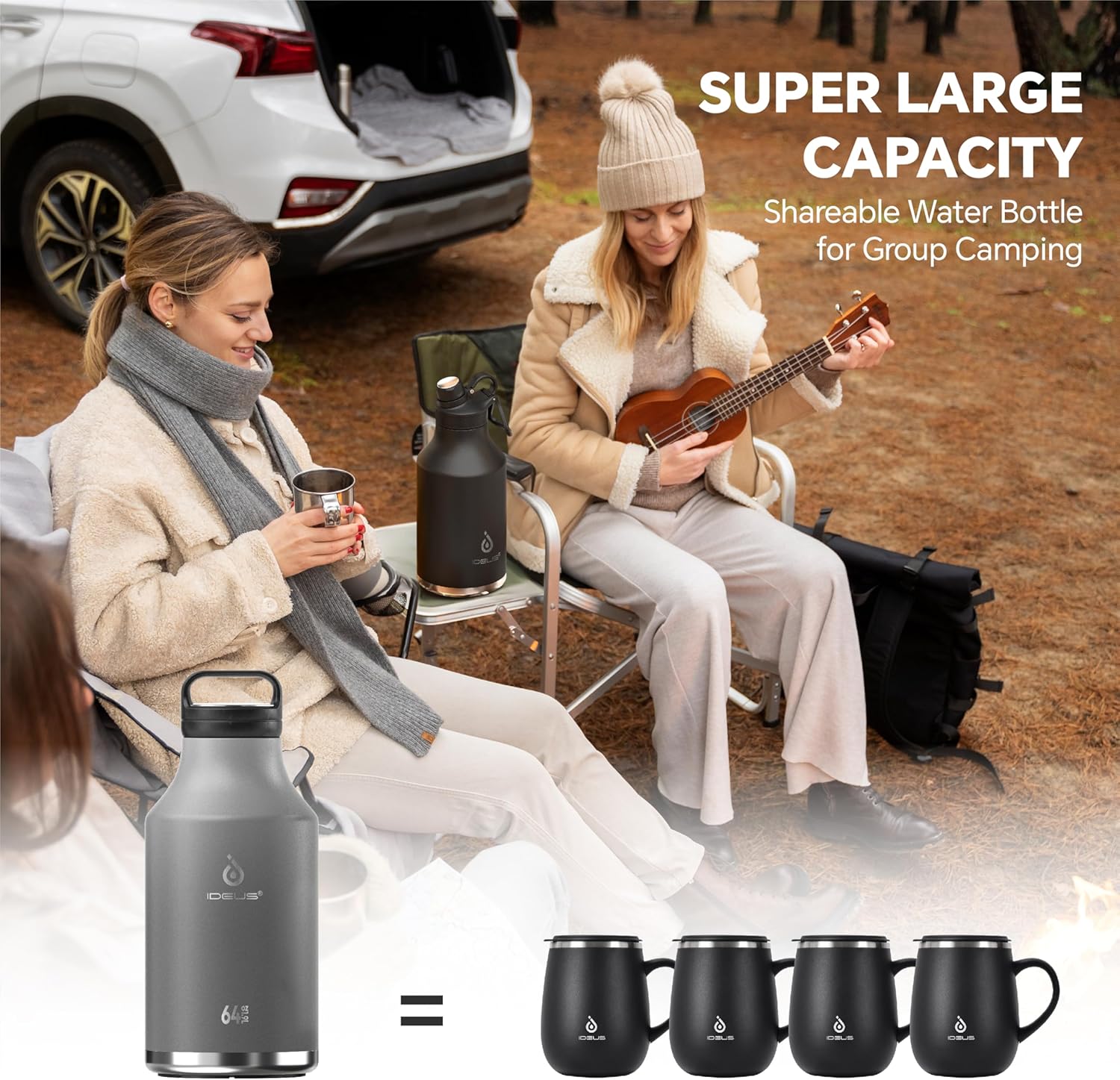 IDEUS Insulated Stainless Steel Water Bottle with 2 Leak-Proof Lids, Thermal Water Flask for Hiking Biking, 64oz, Bright Blue