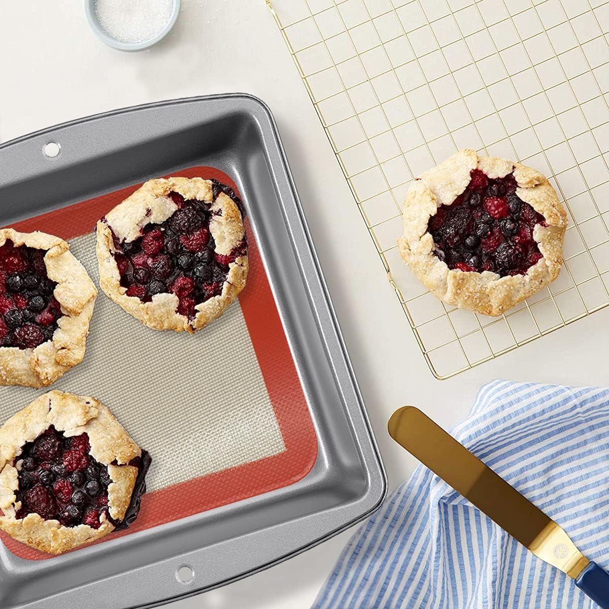 - 【CONVENIENT AND SAVE MONEY, HEALTHY AND ECO-FRIENDLY】 Today, more and more people like to go diet or keep fitness from less oil intake. With these cooks' essentials silicone baking mats square 8x8in, no need any parchment paper, aluminum foils or grease, cooking sprays, oils, etc. on your cake pan or other square baking pans. These baking mats help with your health, your wallet and the earth.