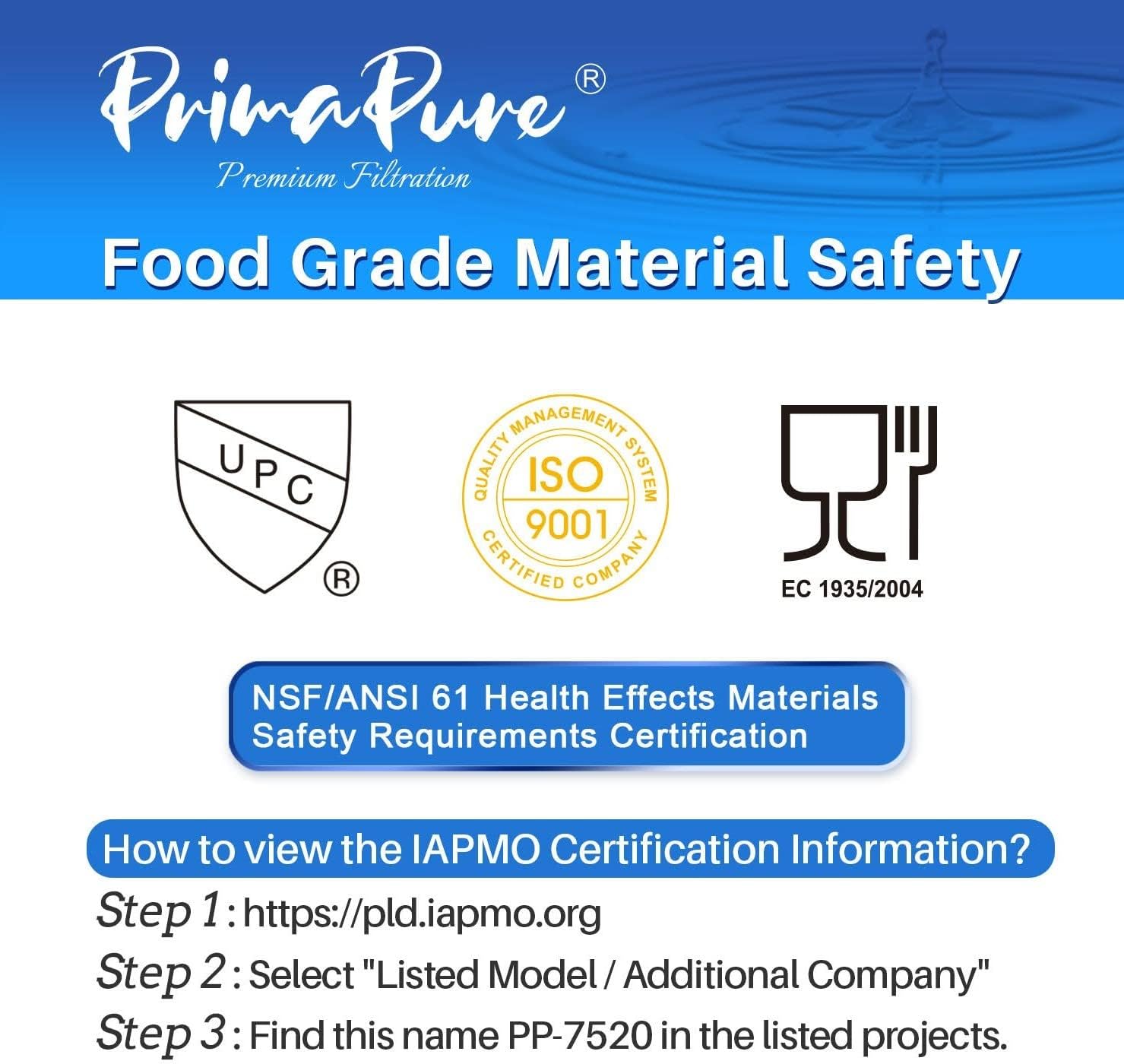 - External Testing Certification : IAPMO, ANSI, NSF