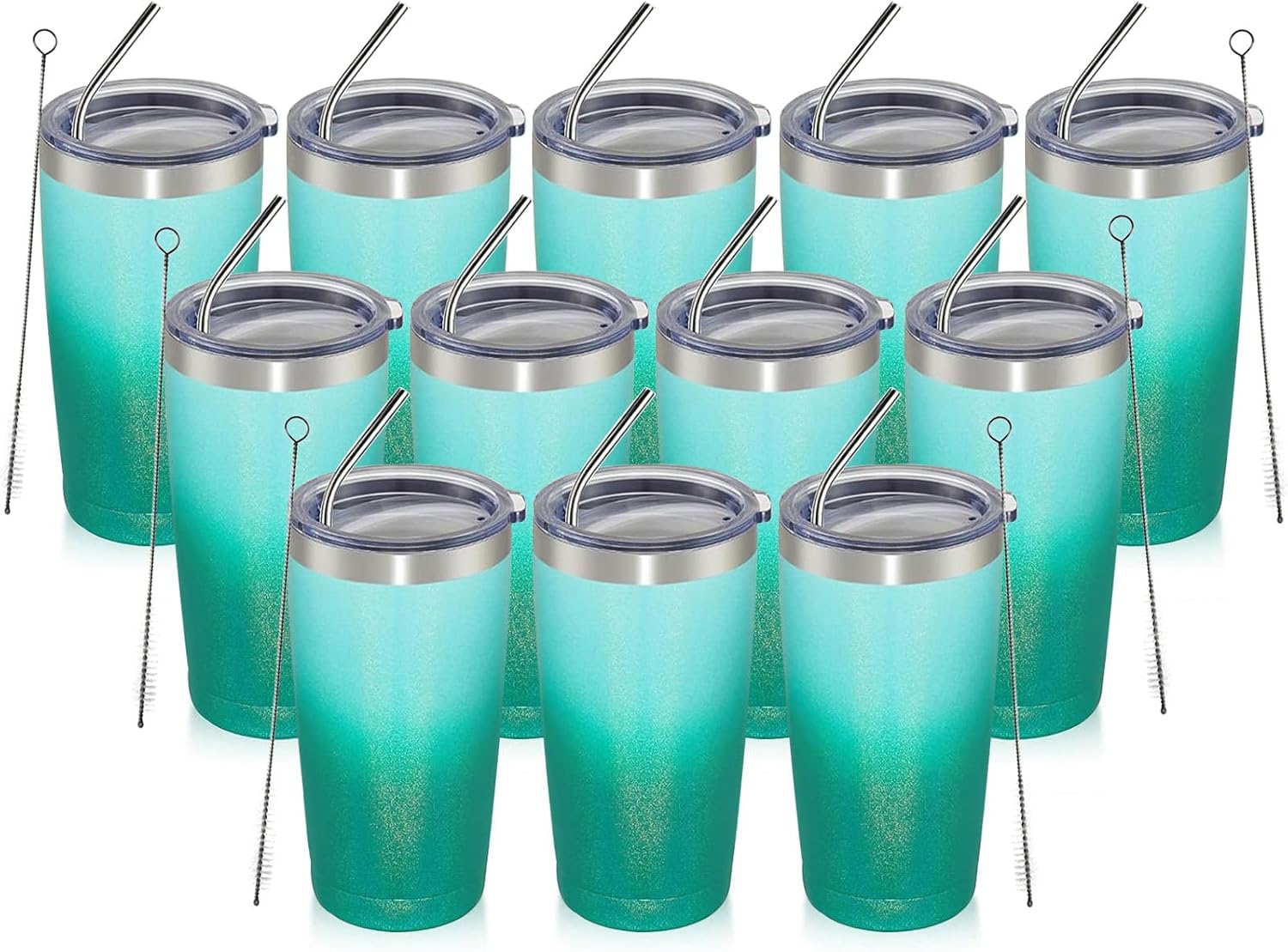 MEWAY 20oz Tumbler 12 Pack Double Wall Vacuum Insulated Travel Glitter Mug Bulk, Stainless Steel Tumblers with Lid and Straw, Powder Coated Coffee Cups for Woman(Gradient Green,Set of 12)