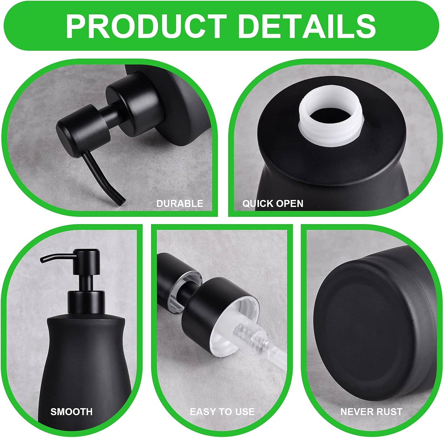 - ♛Easy to use - With a simple downward pressure pump mechanism, our soap dispensers are easy to use and provide the perfect amount of soap or lotion every time.