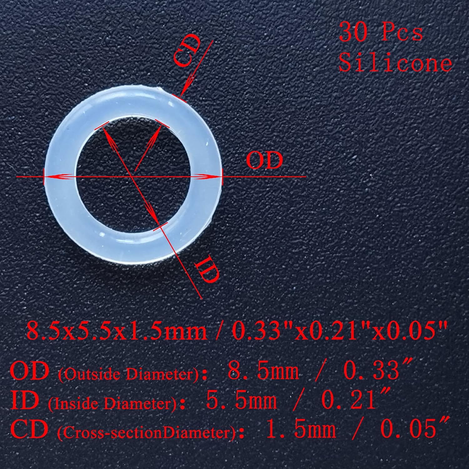 - [Specifications & Notice] - Material: Silicone(VMQ). Size: 8.5x5.5x1.5mm / 0.34"x0.22"x0.06"(OD x ID x Cross-Section Dia). Package: 30 Pcs. [Notice] - Please Confirm the Required Material and Size before purchasing, and put in the right place.