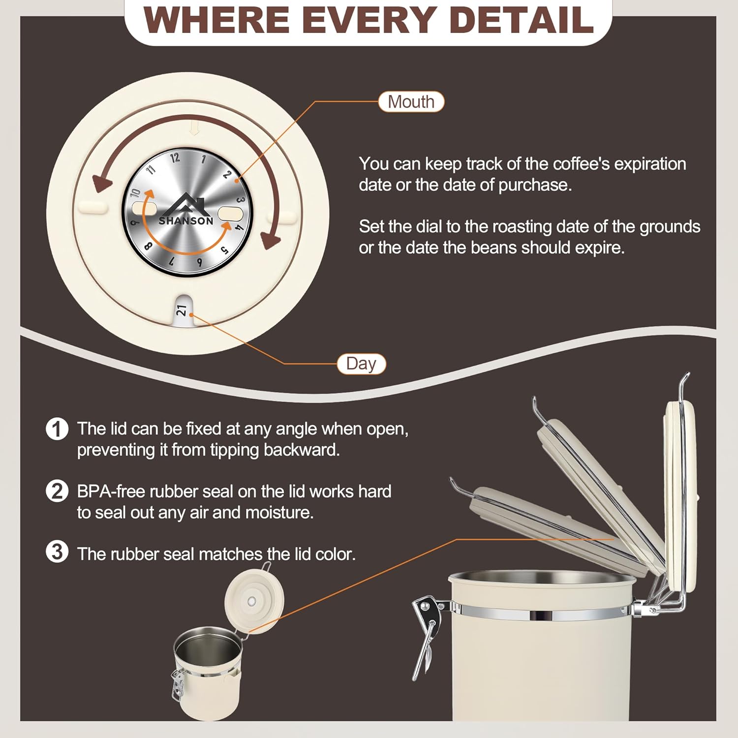 ShanSon Coffee Canister Airtight Coffee Container Stainless Steel Coffee Bean Storage Container with Scoop Coffee Canister for Beans Grounds Sugar Flour Tea Cereal,22OZ,Beige