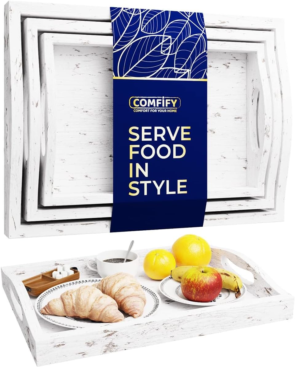 Serving Trays Set of 3 - Ottoman Wood Trays for Entertainment, Food and Decor - Rustic Farmhouse Distressed Wood Finish - Solid White