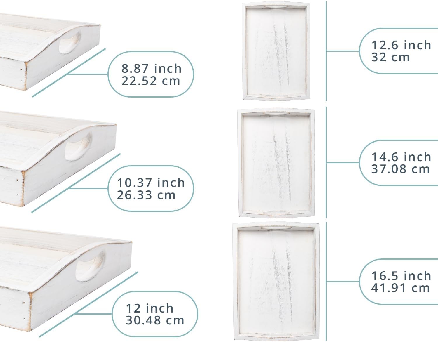 - Convenient dimensions: Measuring around 16.5” wide and 12” length for the larger tray, 14.5” wide and 10.5” length for the medium tray, and 12.5” wide and 9” length for the smallest tray, they are Perfect for serving guests drinks and appetizers, breakfast-in-bed or for decorating your coffee table.