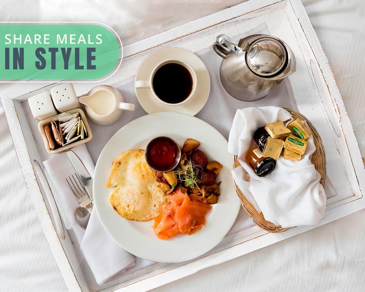 - Farmhouse wooden serving trays: Use them to serve drinks, breakfast in bed, coffee at hotels, bars, or coffee shops. Made from natural bamboo wood, these durable serving trays will help you do the tasks you need while also saving nature by being biodegradable.