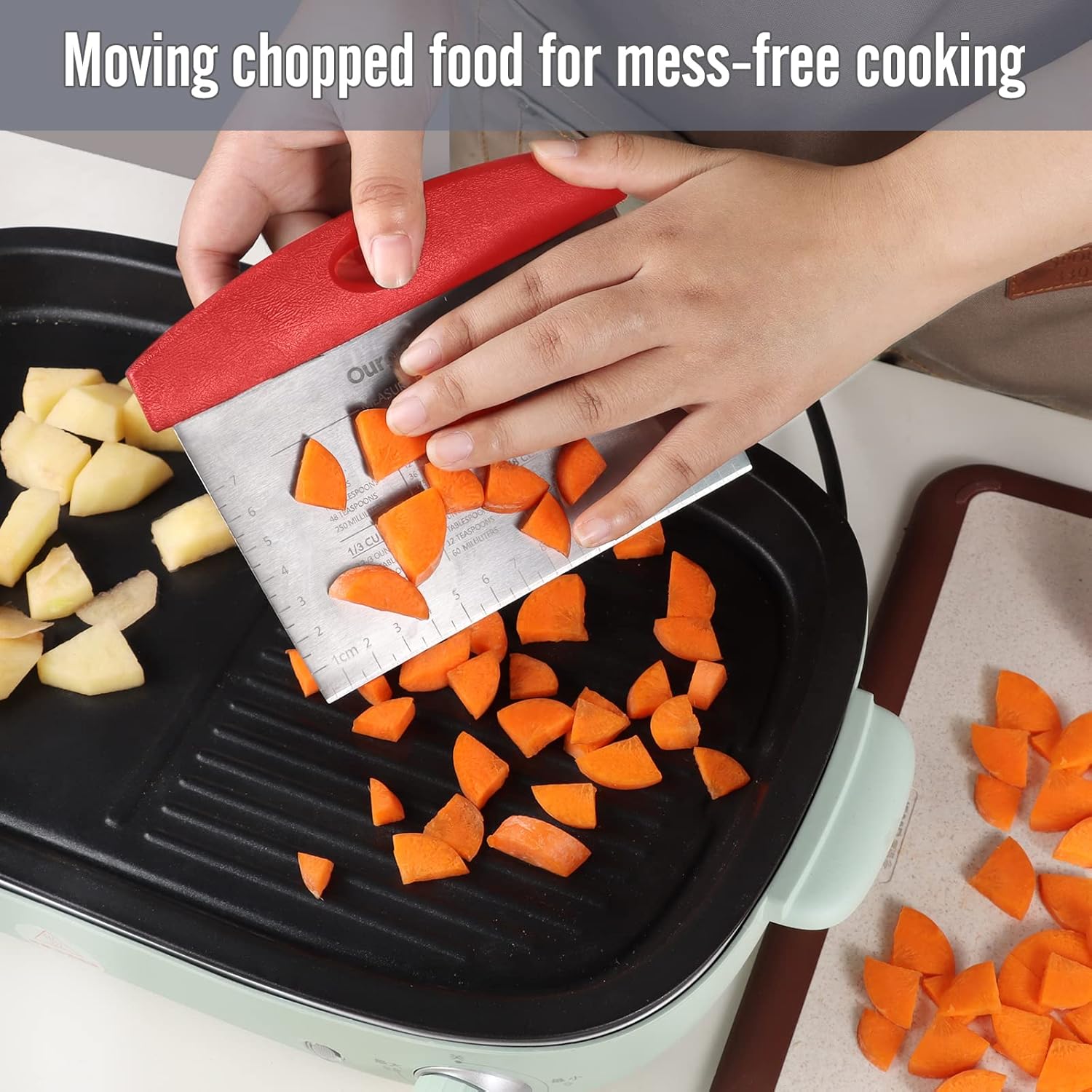Ourokhome Dough Pastry Bench Cutter Scraper, Stainless Steel Pizza Cutter for Kitchen Baking, Dishwasher Safe, Anti-Wear Laser-Engraved Measuring Scale and Conversion Chart, 2 Pack, Red