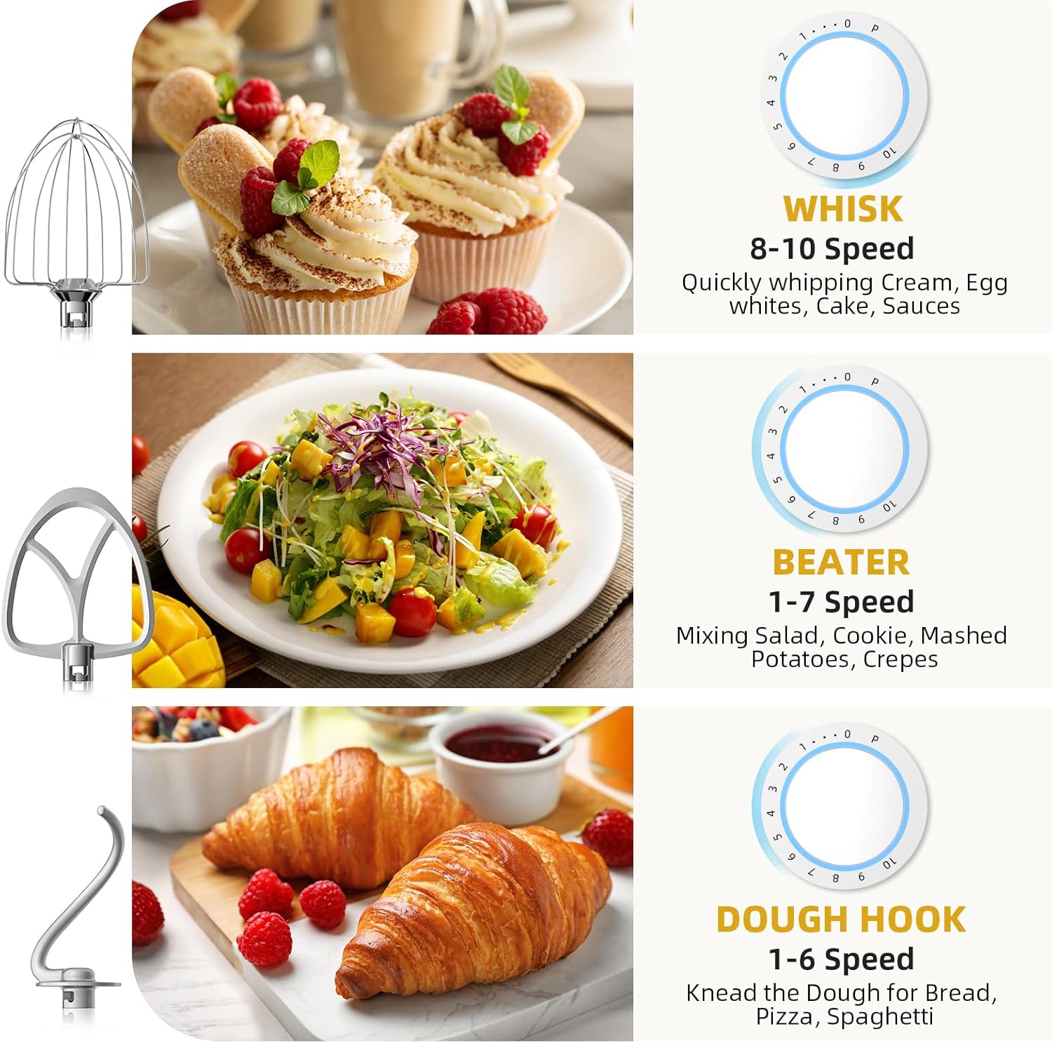 - Greater Control Over 10+P Speeds: Peicual electric stand mixer provides you with a superior mixing performance experience. 10 different speed options, make the blending action thorough and fast, easy to the various recipe such as cakes, bread, cookies, salads, muffins, etc. Use the PULSE function to provide precision control when required a quick burst of power or for quickly incorporations