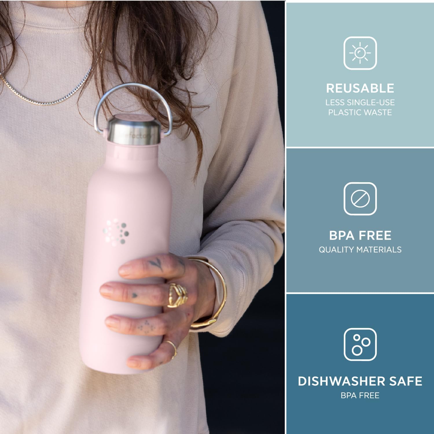 - DURABLE COATING - Stainless Steel bottle has a durable powder coating, which provides an easy grip, plus a slip resistant silicone base