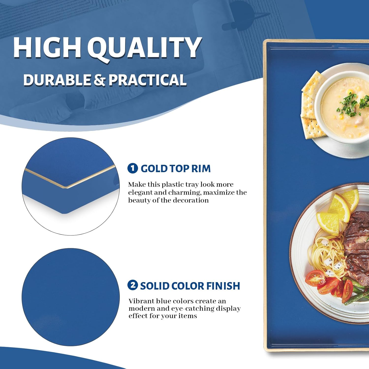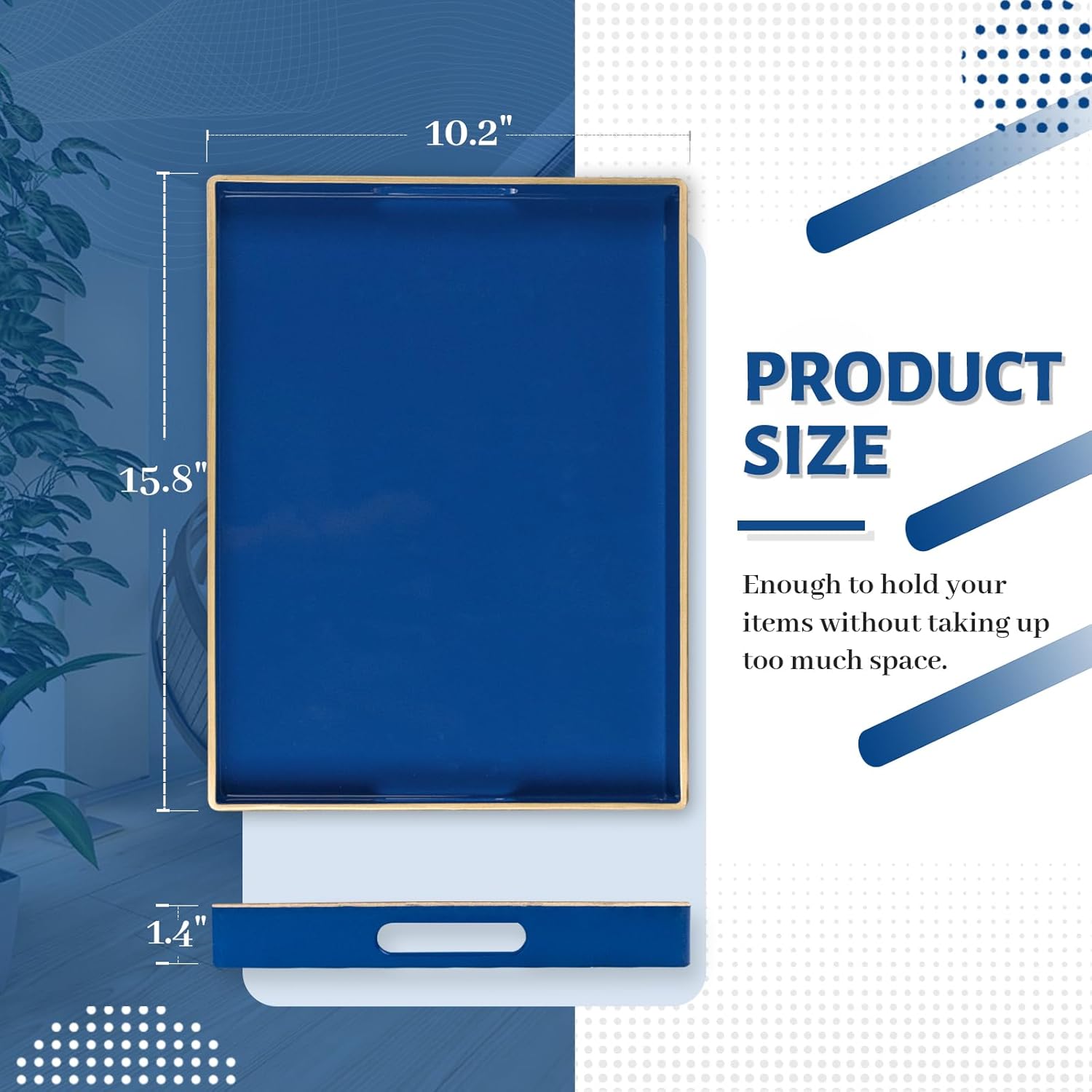 - TRAY DECOR: Navy blue tray is often used to present food and drinks in an appealing and organized manner. Rectangle tray can enhance the visual appeal of the items being served, making them more enticing to guests or customers. Also place it on your bathroom vanity as an exquisite showcase for perfumes, jewelry, or bath accessories.