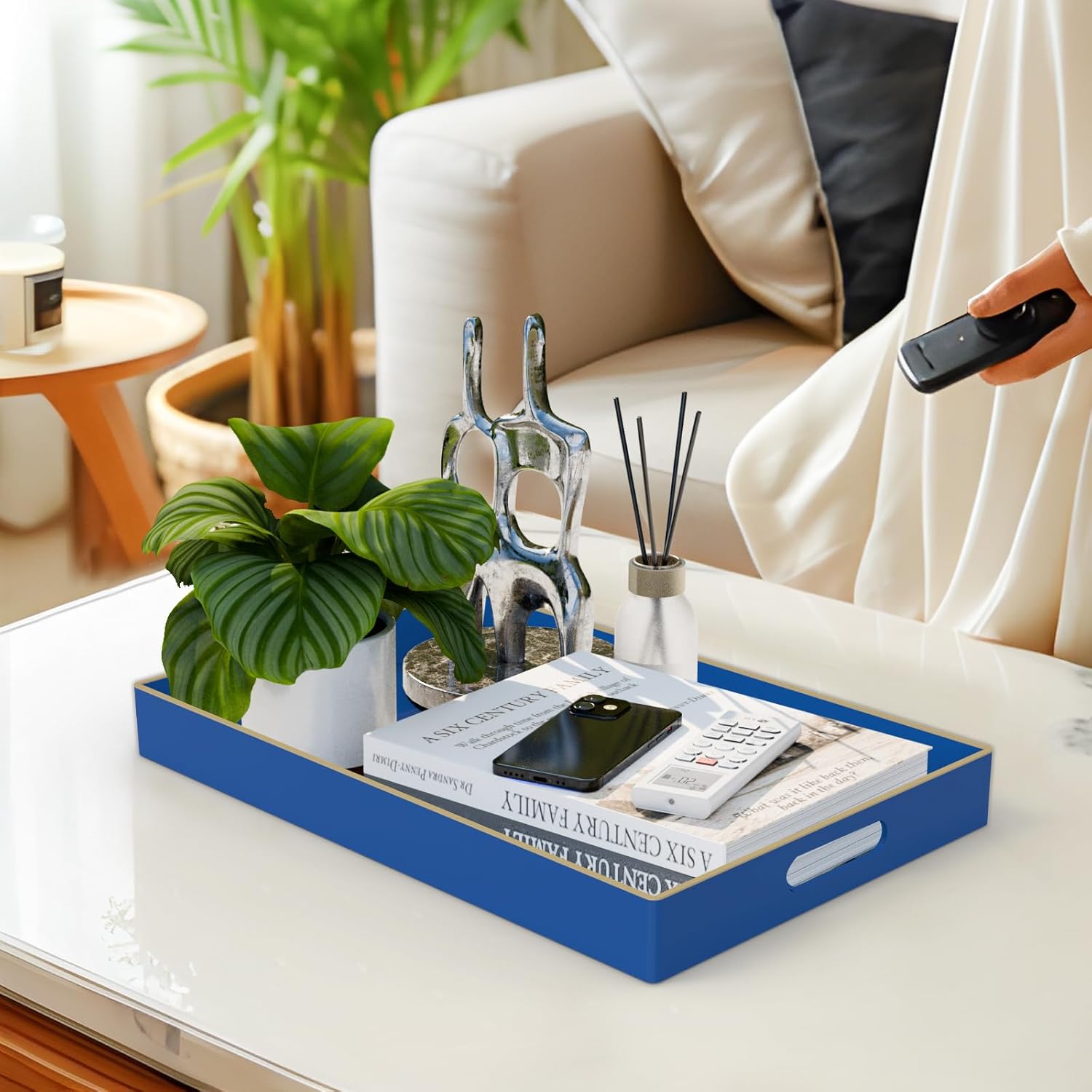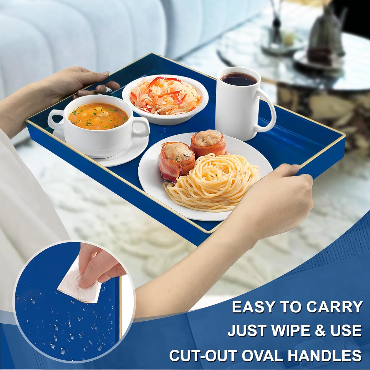 - EASY TO CLEANING: Coffee table tray featuring a classic rectangle design with a navy blue glossy finish and golden top edging, brings a elegance and adds a beautiful touch. Modern blue serving tray has a smooth surface that is waterproof and easy to clean, just use a damp cloth to clean.