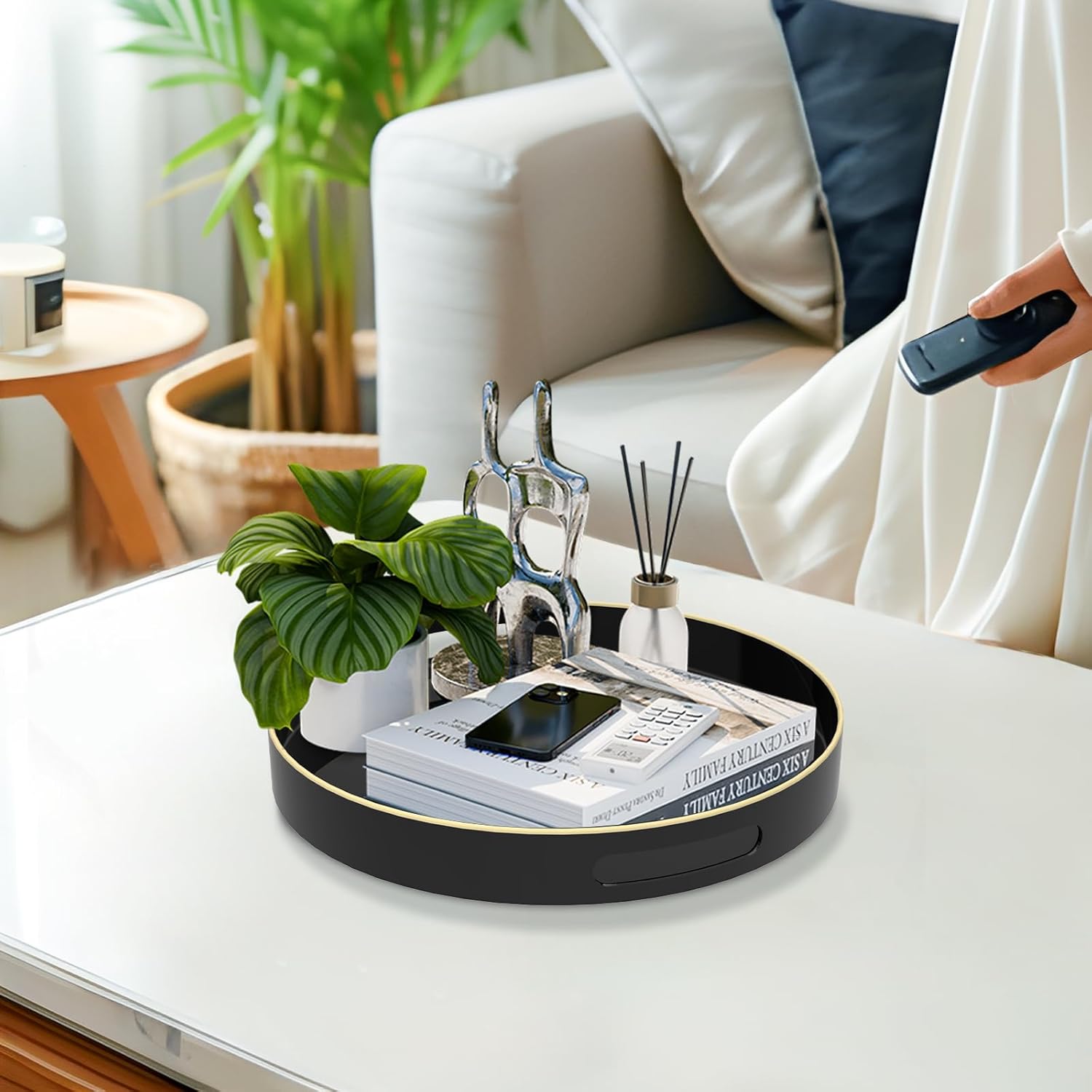 - EASY TO CLEANING: Coffee table tray featuring a classic round design with a black glossy finish and golden top edging, brings a elegance and adds a beautiful touch. Modern black serving tray has a smooth surface that is waterproof and easy to clean, just use a damp cloth to clean.