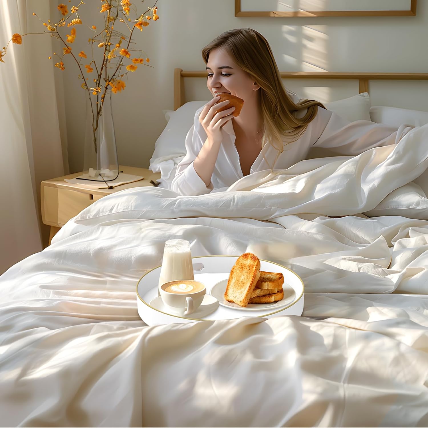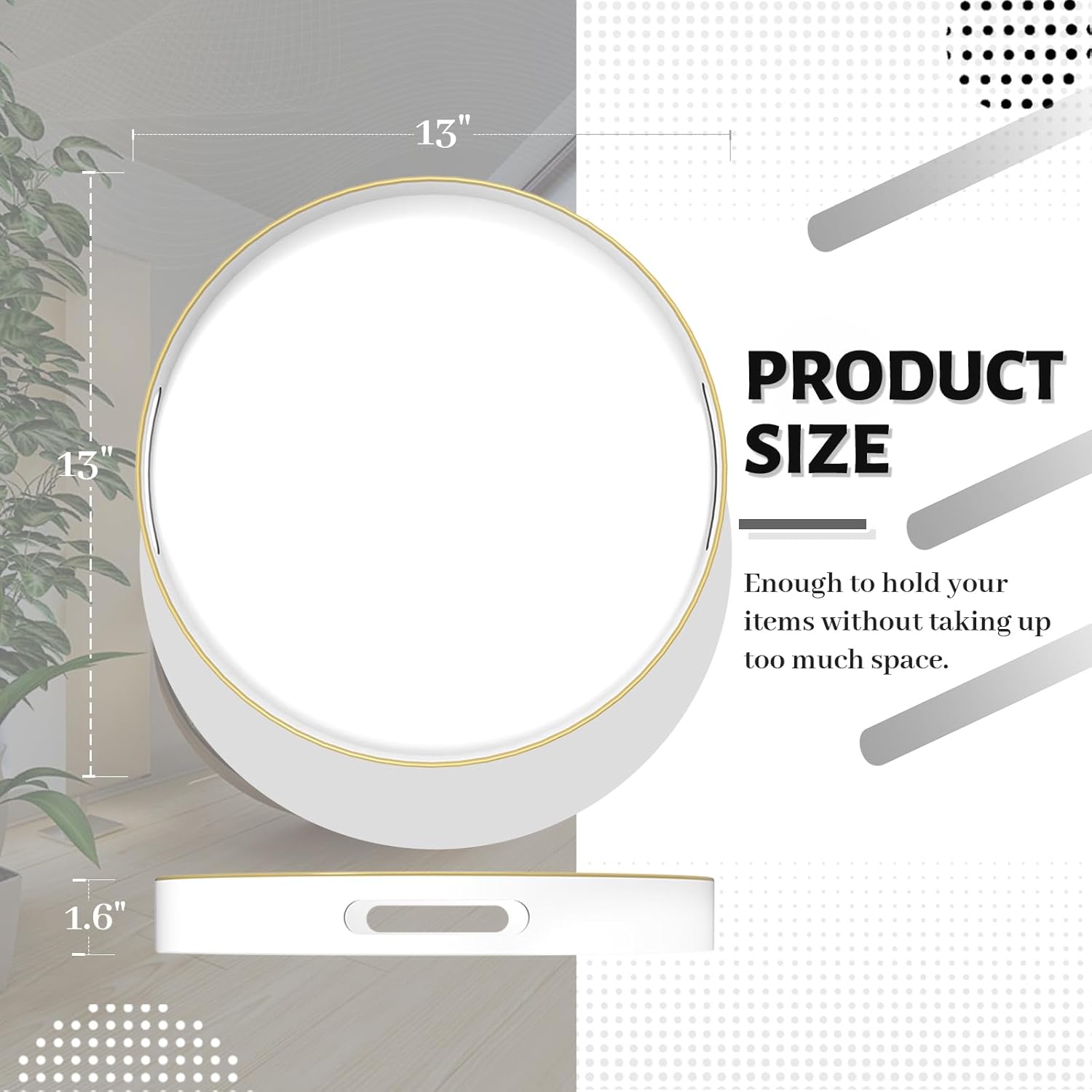 - TRAY DECOR: White tray is often used to present food and drinks in an appealing and organized manner. Round table tray can enhance the visual appeal of the items being served, making them more enticing to guests or customers. Also place it on your bathroom vanity as an exquisite showcase for perfumes, jewelry, or bath accessories.