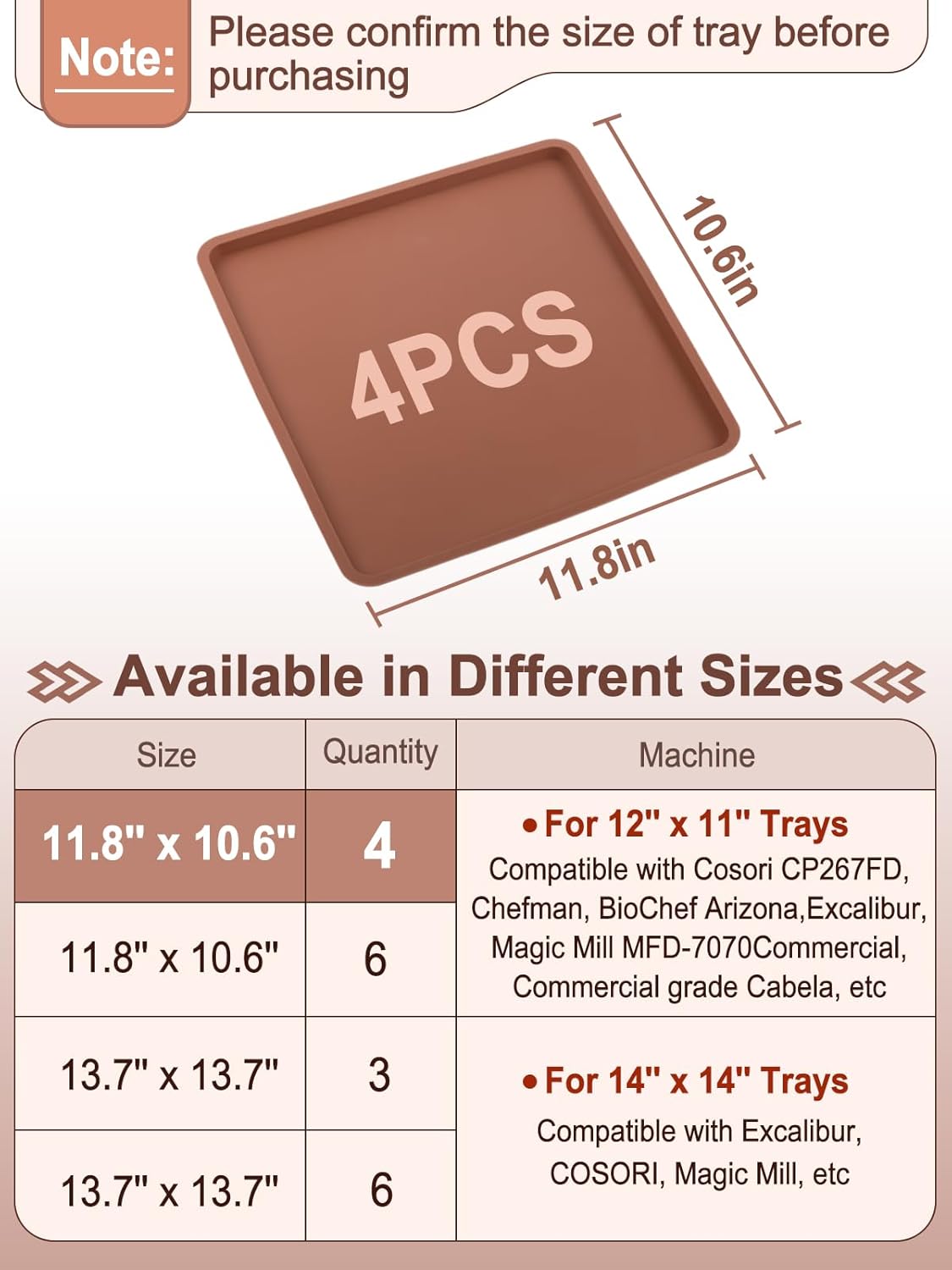 - Perfect Size: Our silicone tray liner measures 10.6'' × 11.8'', suitable for 11'' × 12'' metal trays, also compatible with Cosori CP267-FD, Chefman, BioChef Arizona, Magic Mill MFD-7070 Commercial, Excalibur, commercial grade Cabela and more. Tip: The size of the metal tray cannot be smaller than that of the silicone mats.