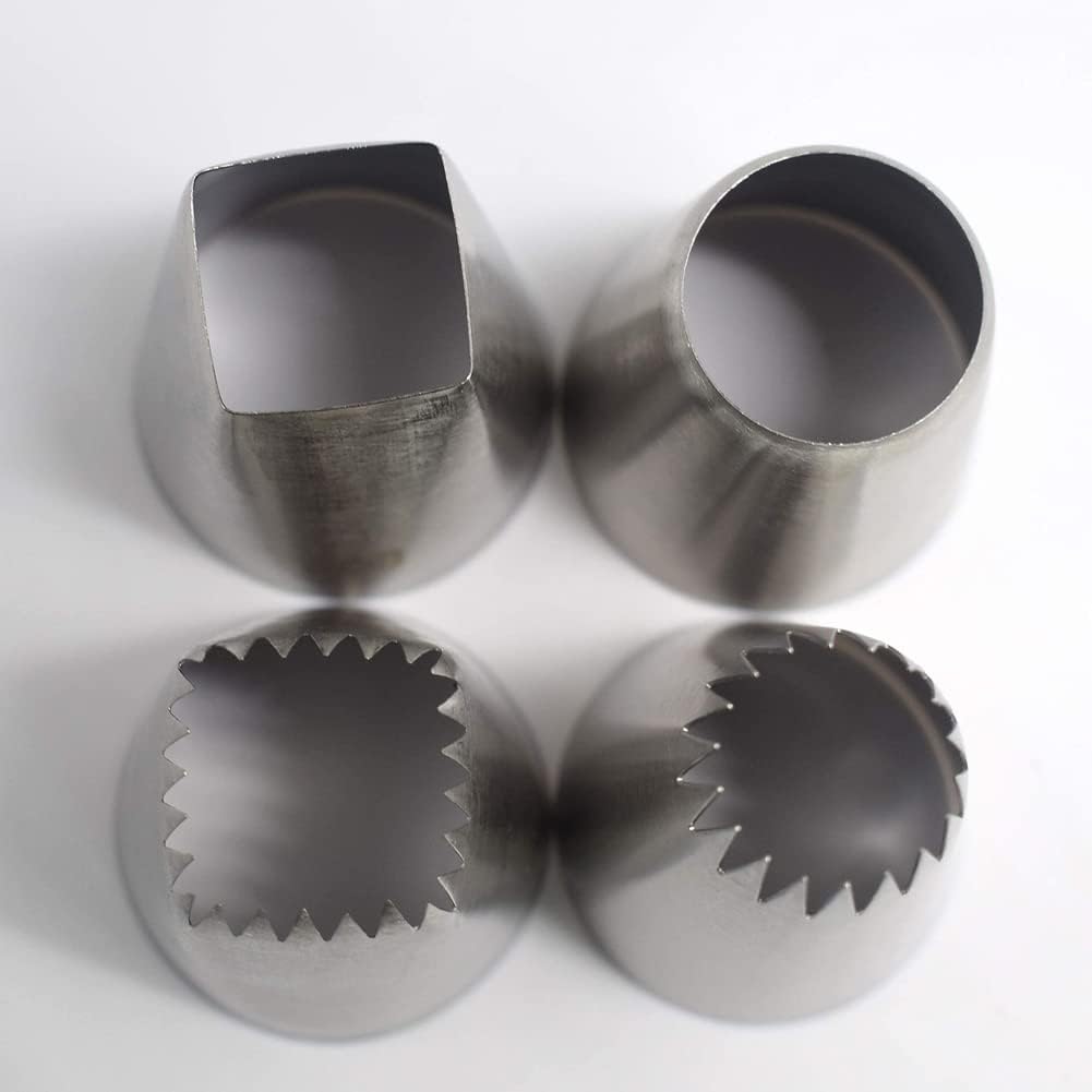 - 4 LARGE PASTRY TIPS:Includes round plain tip,open star decorating tip,French star frosting tip and square icing tips.