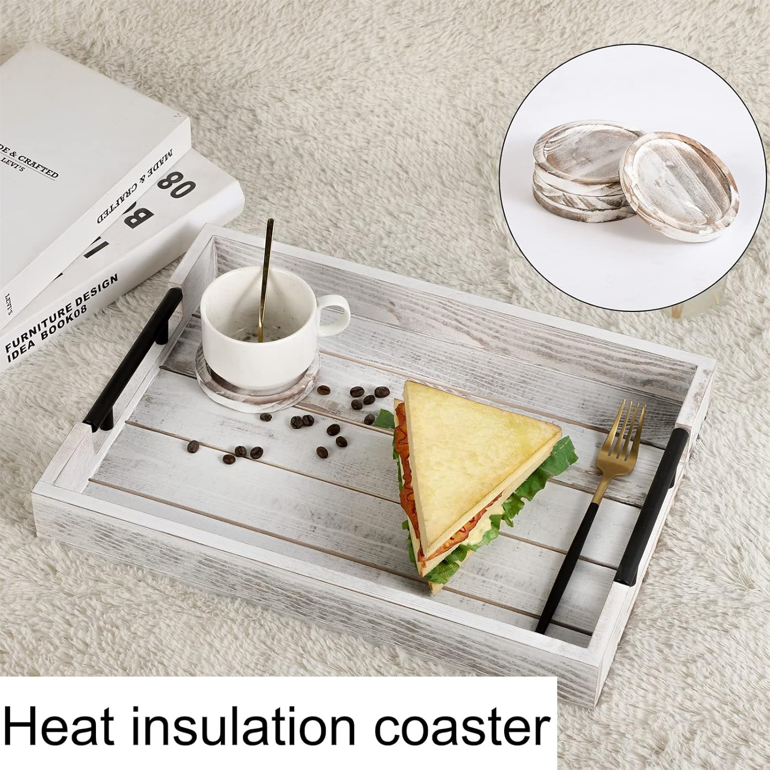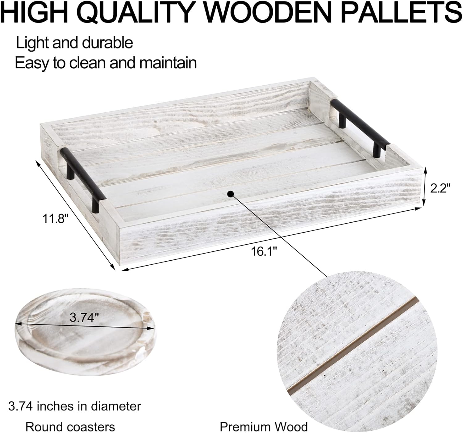 - [Farmhouse Ottoman tray ]:Vintage Decor Ottoman Food Serving Platters.Size is 16.1"x11.8"x1.9".Package include 4 coasters.