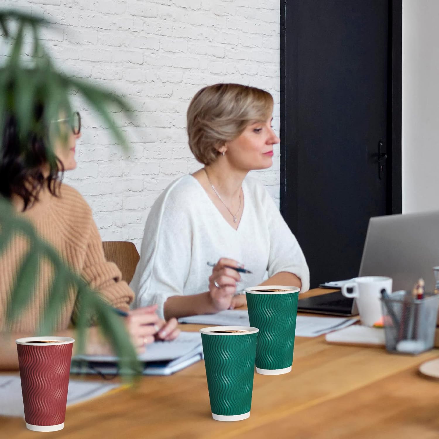 - Package: 90 pack insulated paper coffee cups with 3 colors (red, black, green) is a great deal. Classic and elegant design make these hot coffee cups versatile, perfect for daily or office use, as well as for business use in cafe shops or restaurants