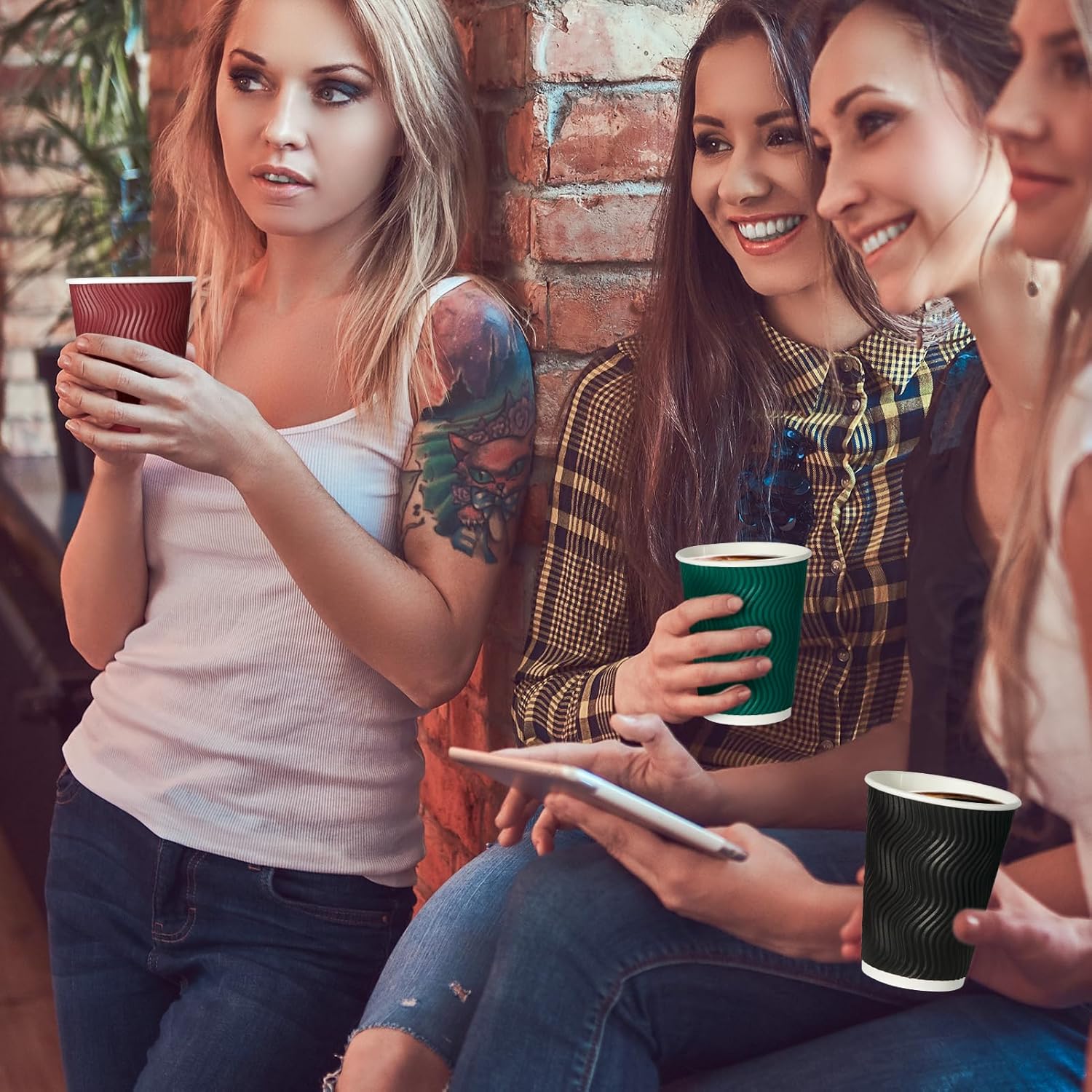 - Package: 120 pack insulated paper coffee cups with 3 colors (red, black, green) is a great deal. Classic and elegant design make these hot coffee cups versatile, perfect for daily or office use, as well as for business use in cafe shops or restaurants