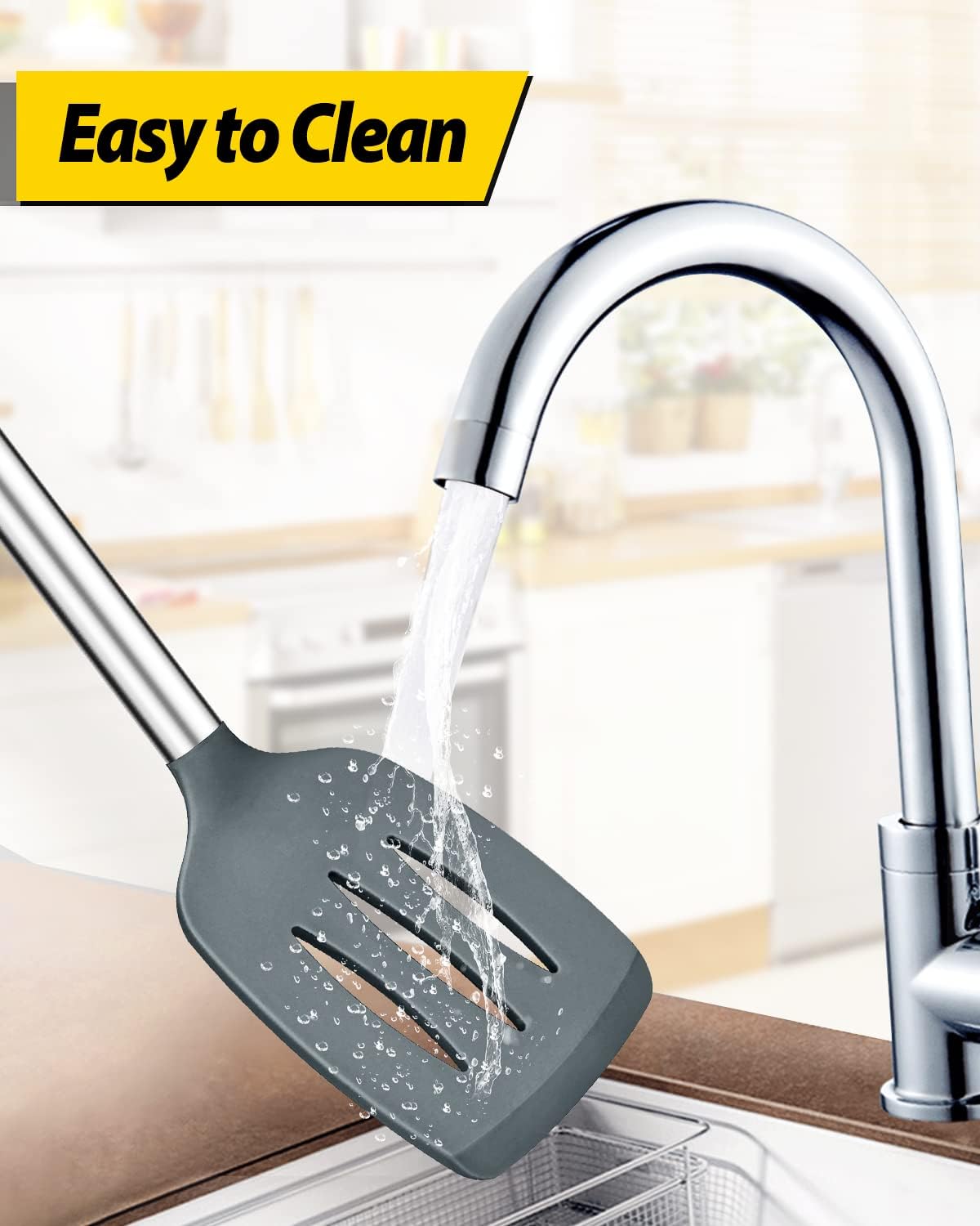 Pack of 4 Silicone Cooking Utensils Set, Non Stick Large Solid Spatulas, Heat Resistant Gray Slotted Spoons, Ideal BPA Free Kitchen Turners for Frying, Mixing,Serving,Draining,Turning,Stirring