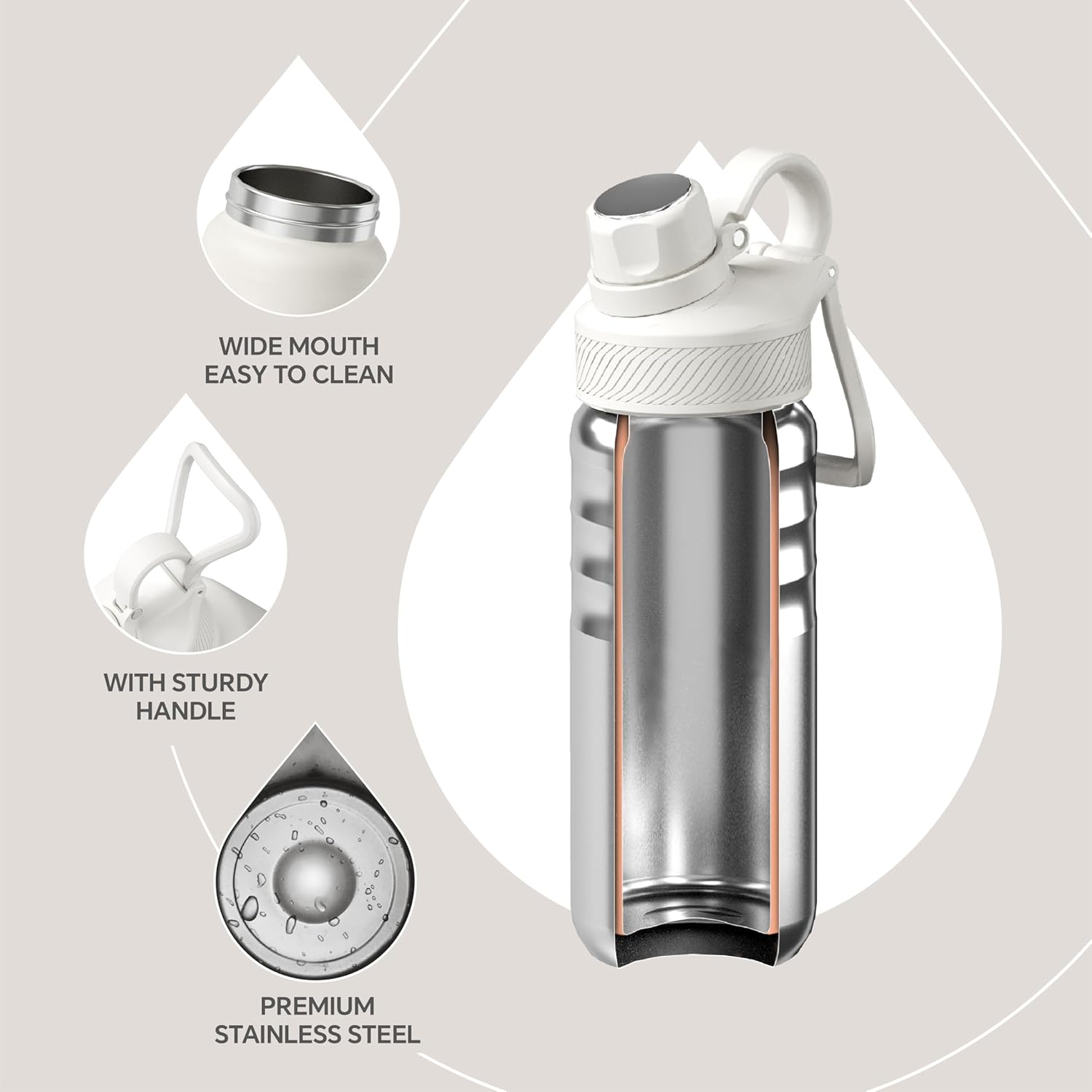 IDEUS Insulated Stainless Steel Water Bottle with 2 Leak-Proof Lids, Thermal Water Flask for Hiking Biking, 18oz, White