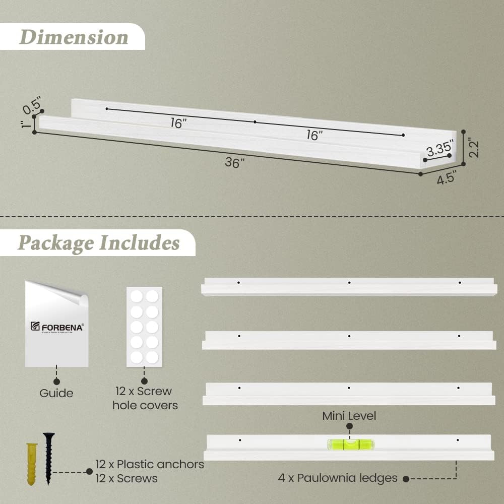 - 【Easy Installation & Breeze Disassembly】These modern & versatile floating shelves 36 inch come assembled in sets of 4. Easy to install when open carton box to hang picture shelves following instuction manual. When disassembling, just remove screws.