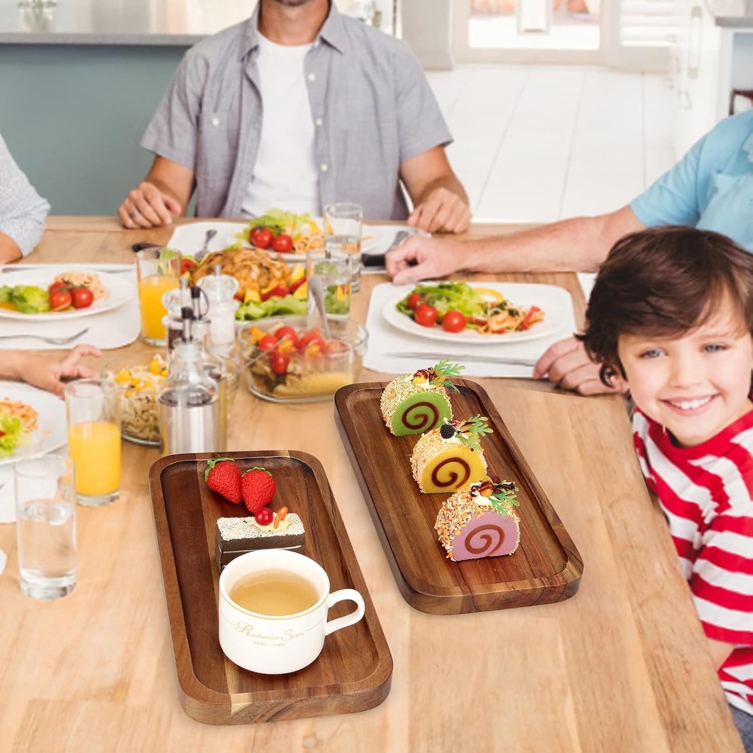 - Package: 2 pcs 12 x 6 inch acacia wood rectangle tray. These acacia serving platters have a beautiful natural warm wood tone and grain that are lovely mix of rustic and elegant.