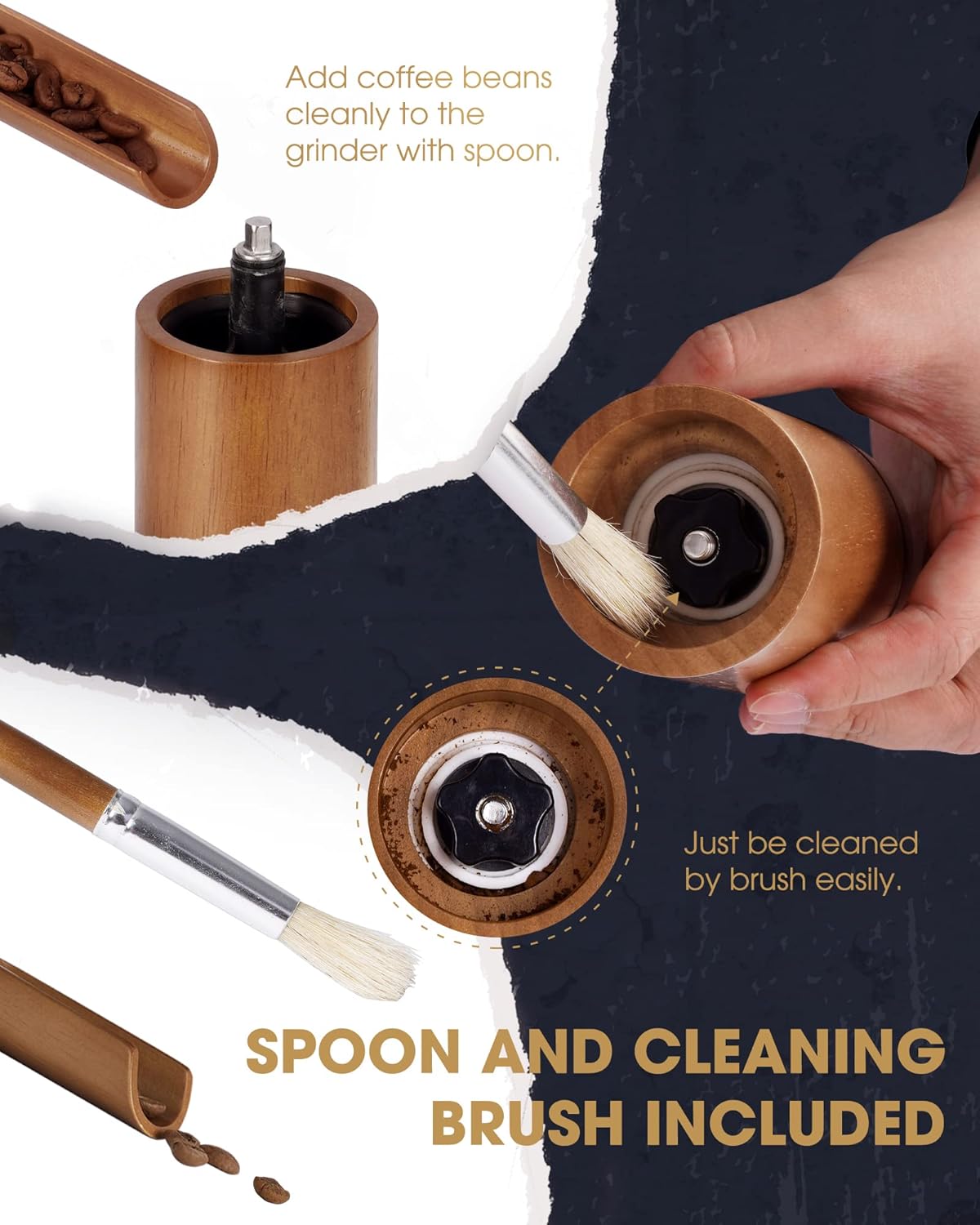 POLIVIAR Manual Coffee Grinder, Coffee Bean Grinder with Adjustable Ceramic Burr, Vintage Style Wooden Hand Coffee Grinder, Portable Burr Coffee Grinder with Brush and Spoon (JX2022-CG10)