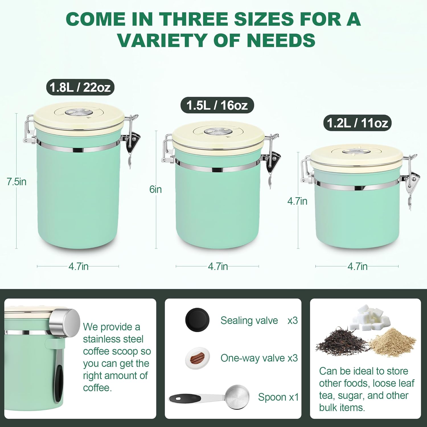 ShanSon Coffee Canister Airtight Coffee Container Stainless Steel Coffee Bean Storage Container with Scoop Coffee Canister for Beans Grounds Sugar Flour Tea Cereal,16OZ,Green