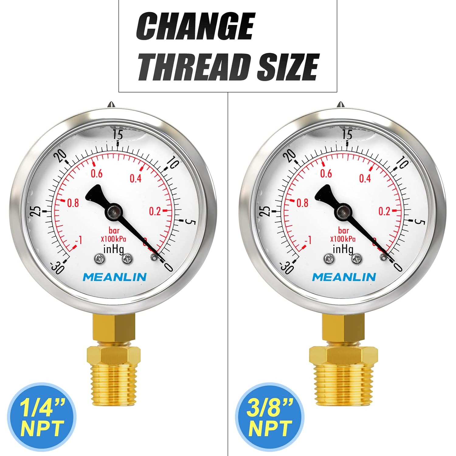MEANLIN MEASURE -30inHG~0Psi Stainless Steel 1/8" NPT 2.5" FACE DIAL Vacuum Pressure Gauge, Lower Mount, with 1/4" NPT and 3/8" NPT Hex Bushing