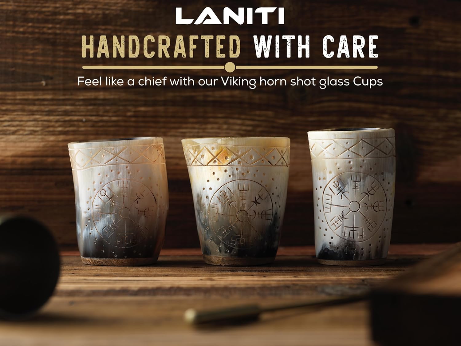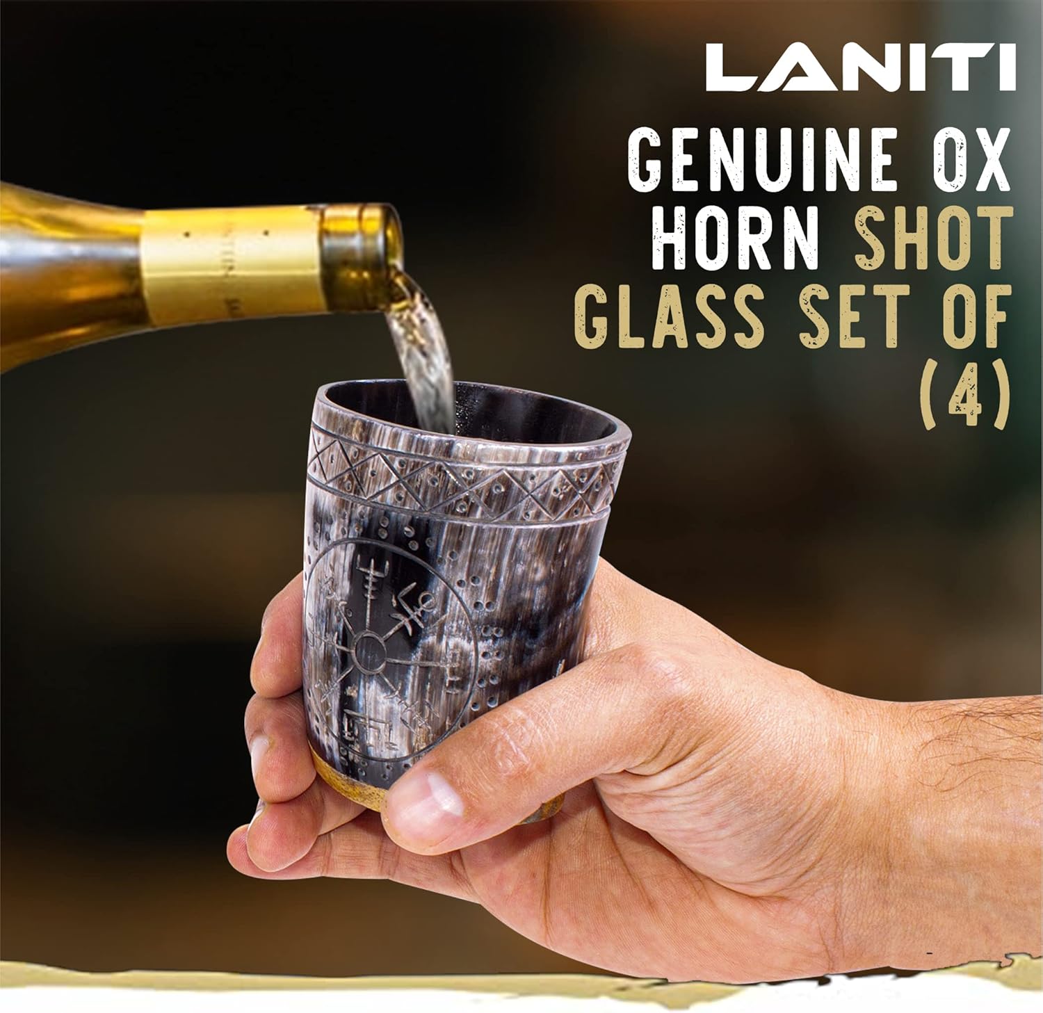 - Cool Rustic Barware Addition: Add bold character to your home bar. These polished horn shot glasses feature engraved designs, making them standout pieces for medieval-style drinkware collectors.