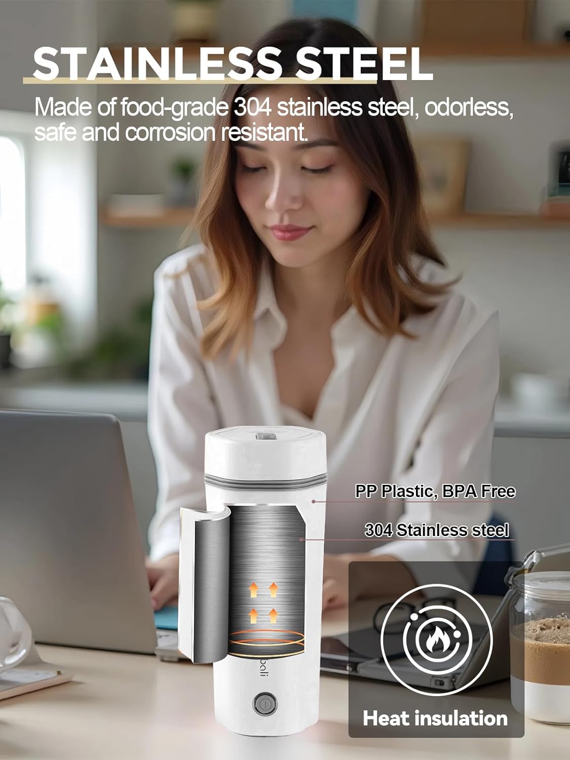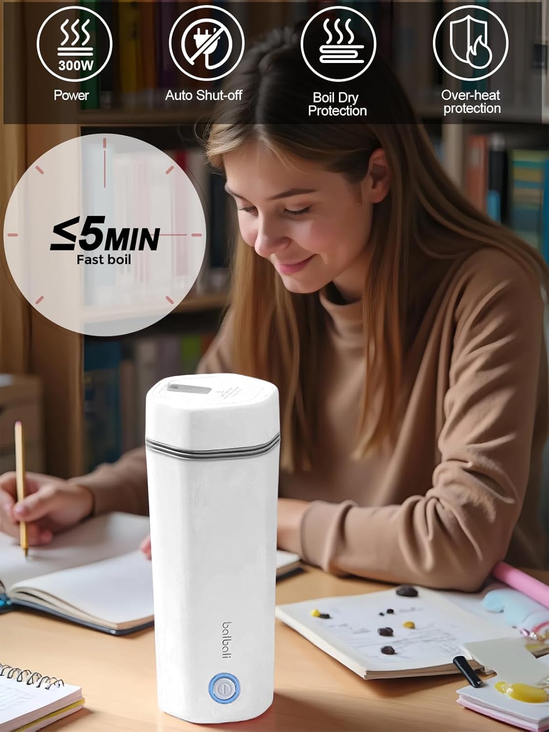balbali Travel Kettle - 12oz Portable Electric Kettle for Boiling Water - Self Heating Cup/Thermos - Single Size Personal Tea Maker -Hot Water Boiler/Heater/Warmer - White