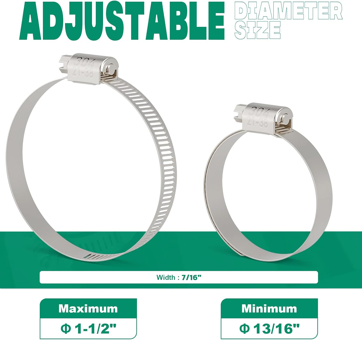 - Adjustable Size Range —Flexible size adjustment,adjustable from 13/16" inch to 1 inch to 1/2" inch (21-38mm).You can use a screwdriver to adjust the size according to your needs.These worm gear hose clamps can be reused and recycled,our quality can withstand long working hours,saving you a lot of money