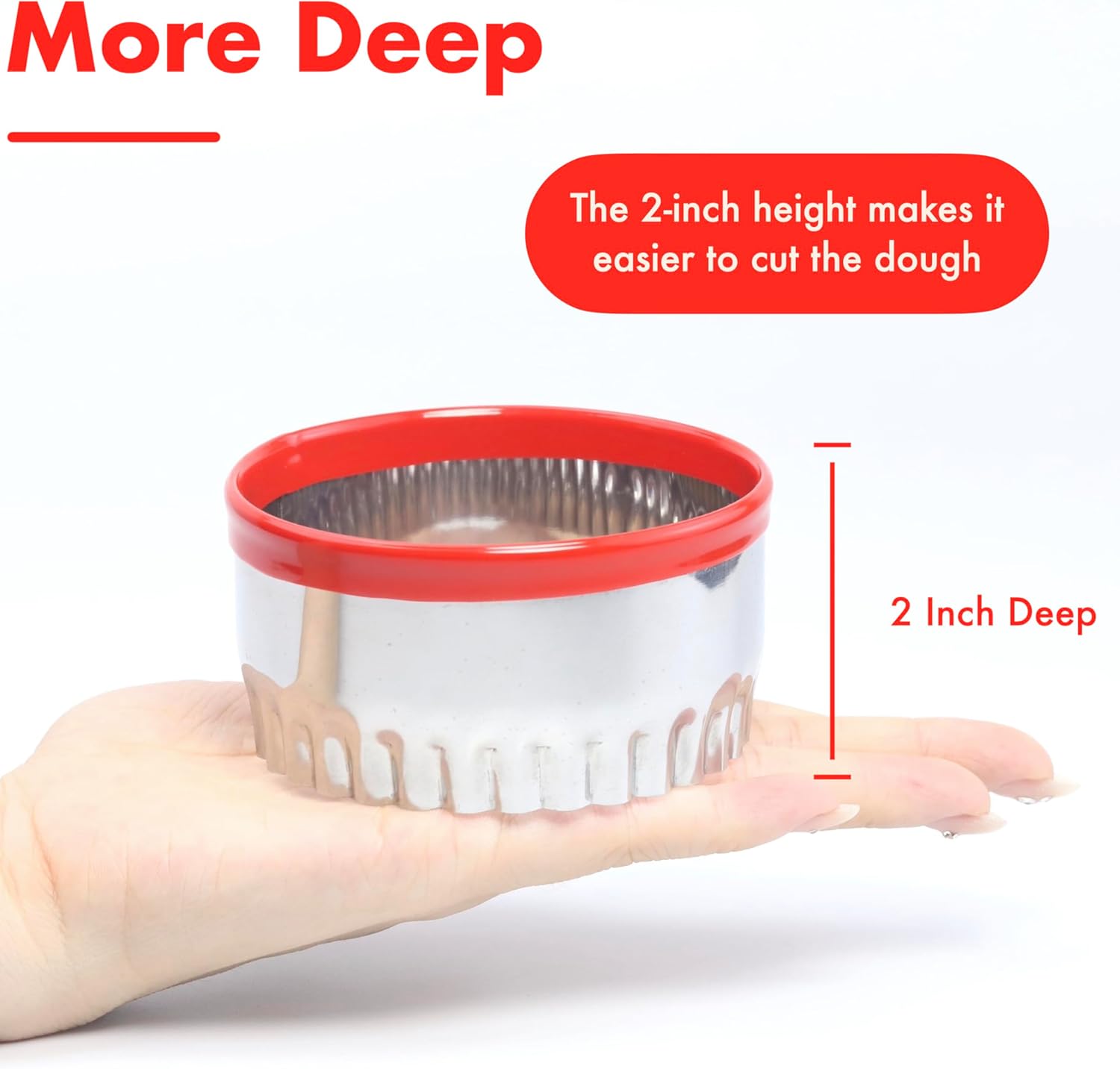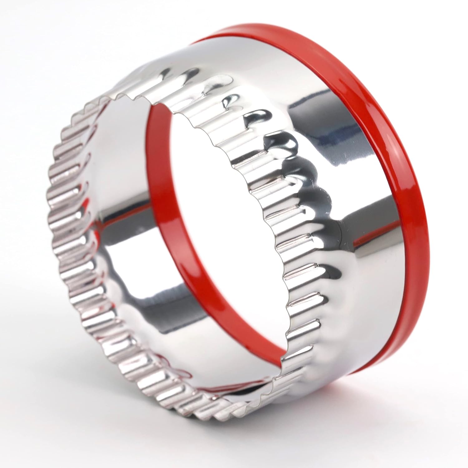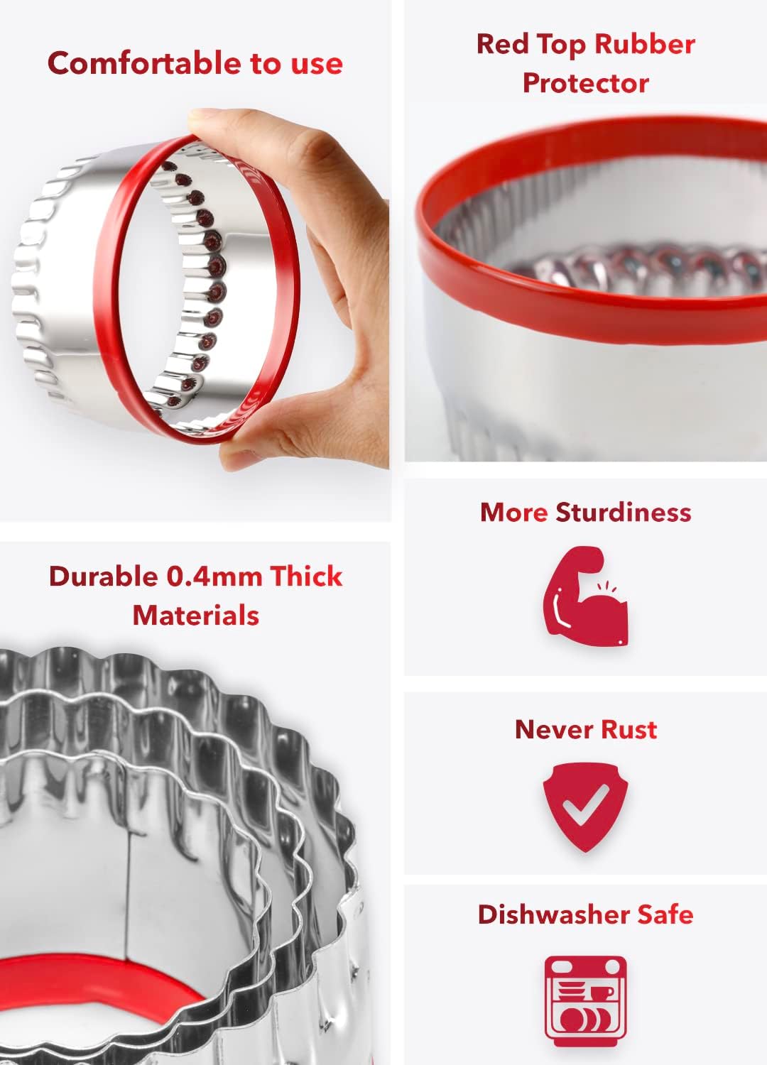 - Red Top Circle Cookie Cutters: The top edge of the cookie cutters is wrapped in food-grade PVC material, making it easy to tell the front and back of the cookie cutters, while protecting your fingers as you use them.