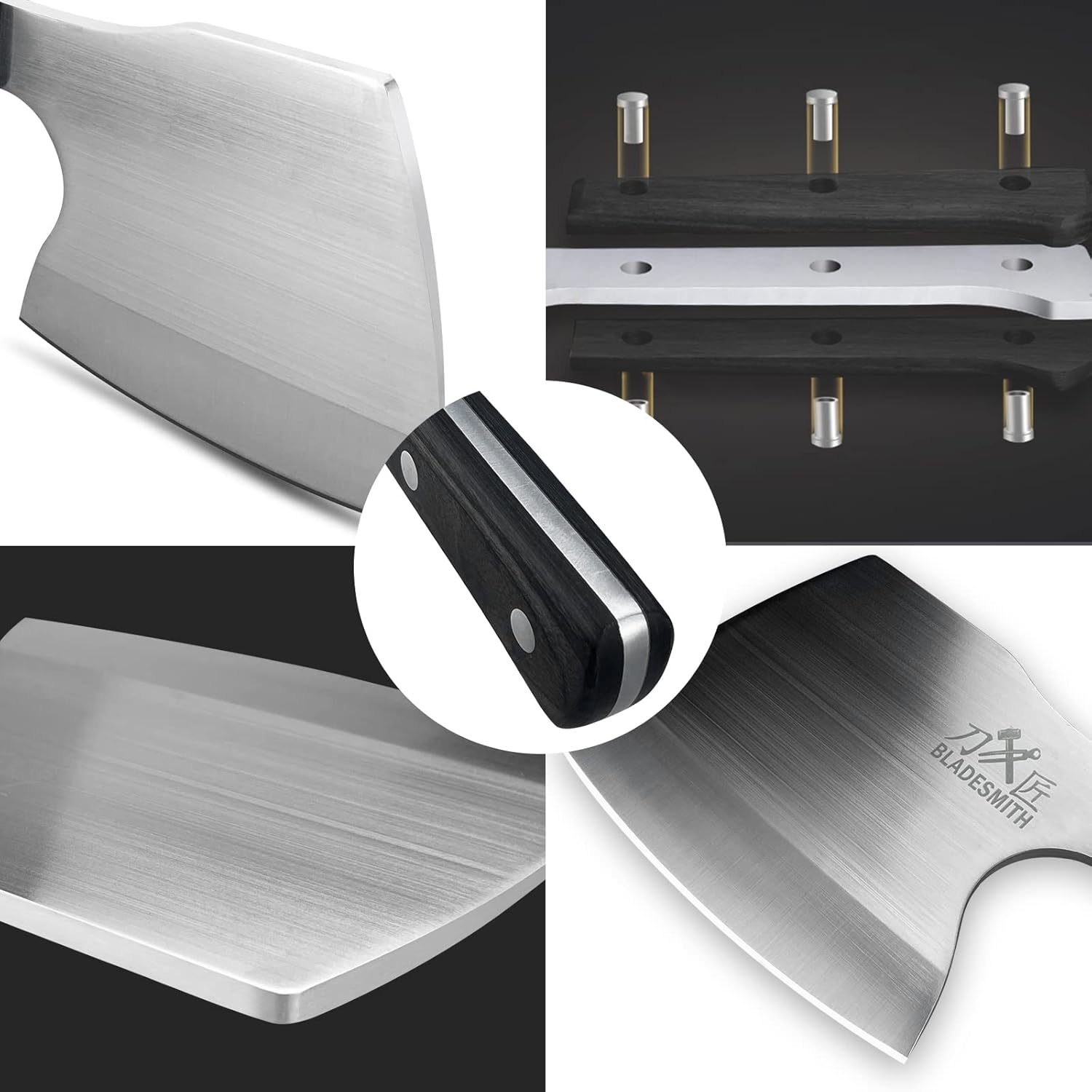 - ④【MULTIPURPOSE】- You'll know it can deal with tough bone guys by its thicken look, let alone you can use it for cutting meat, vegetable or even mashing potato and garlic with its spine. Just so easy! Oh, smashing bones with its spine is not a problem, either.
