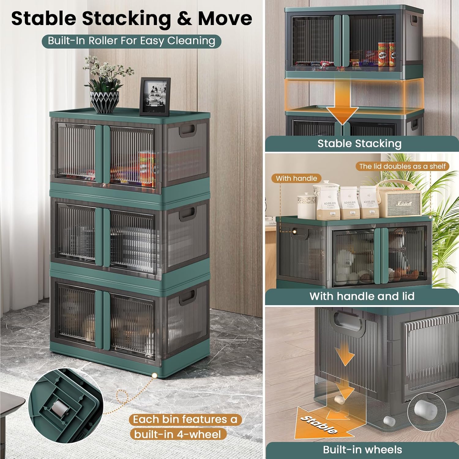 - Stable Stacking & Move: Each storage bin features a built-in recessed 4-wheel base that can move side-to-side, with a full-ground contact design for enhanced stability. The lid of each bin includes 4 built-in grooves for secure stacking