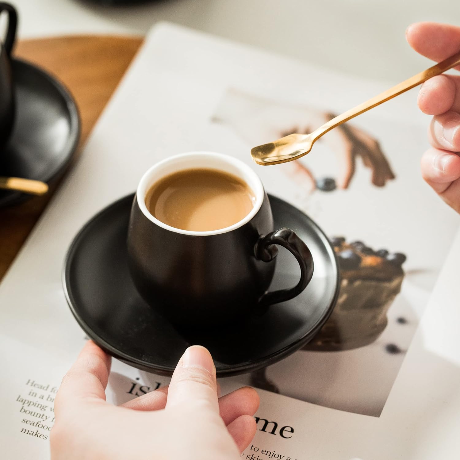 - The espresso coffee cup and saucer set with matted design style is delicate and elegant. The porcelain espresso cups and saucers set is ideal for that morning single-shot or double shot of espresso, or to enjoy a dessert time or tea time. The saucer easily holds your coffee cup, coffee scoop, or sugar packet. The beautiful spoon will give you a pleasant feeling when drinking tea or coffee.