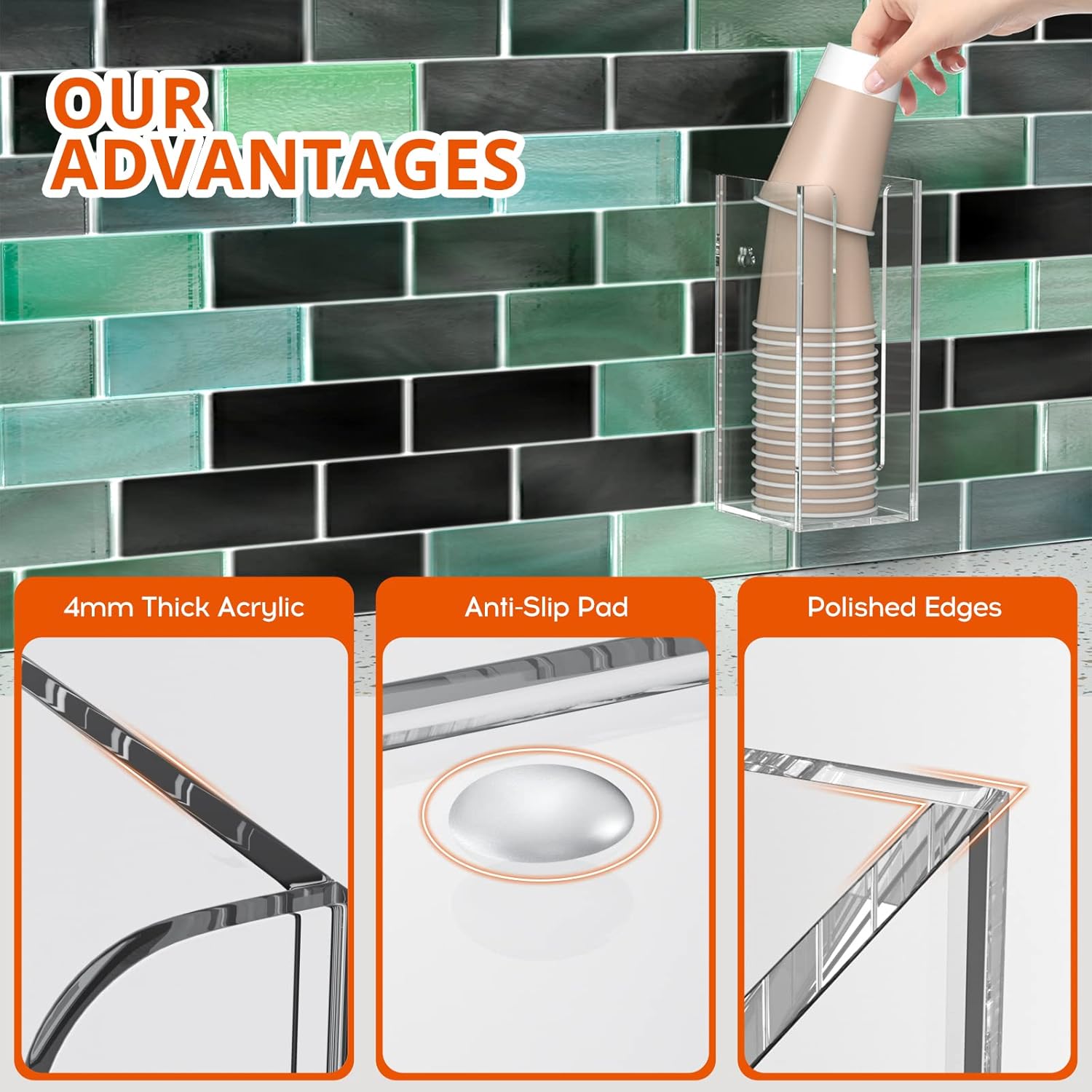 - Functional - comes with 2 pre-drilled holes on the back of the acrylic cup dispenser storage organizer, it can be either mounted on wall or placed on countertops of your bathroom, kitchen, office, coffee station.
