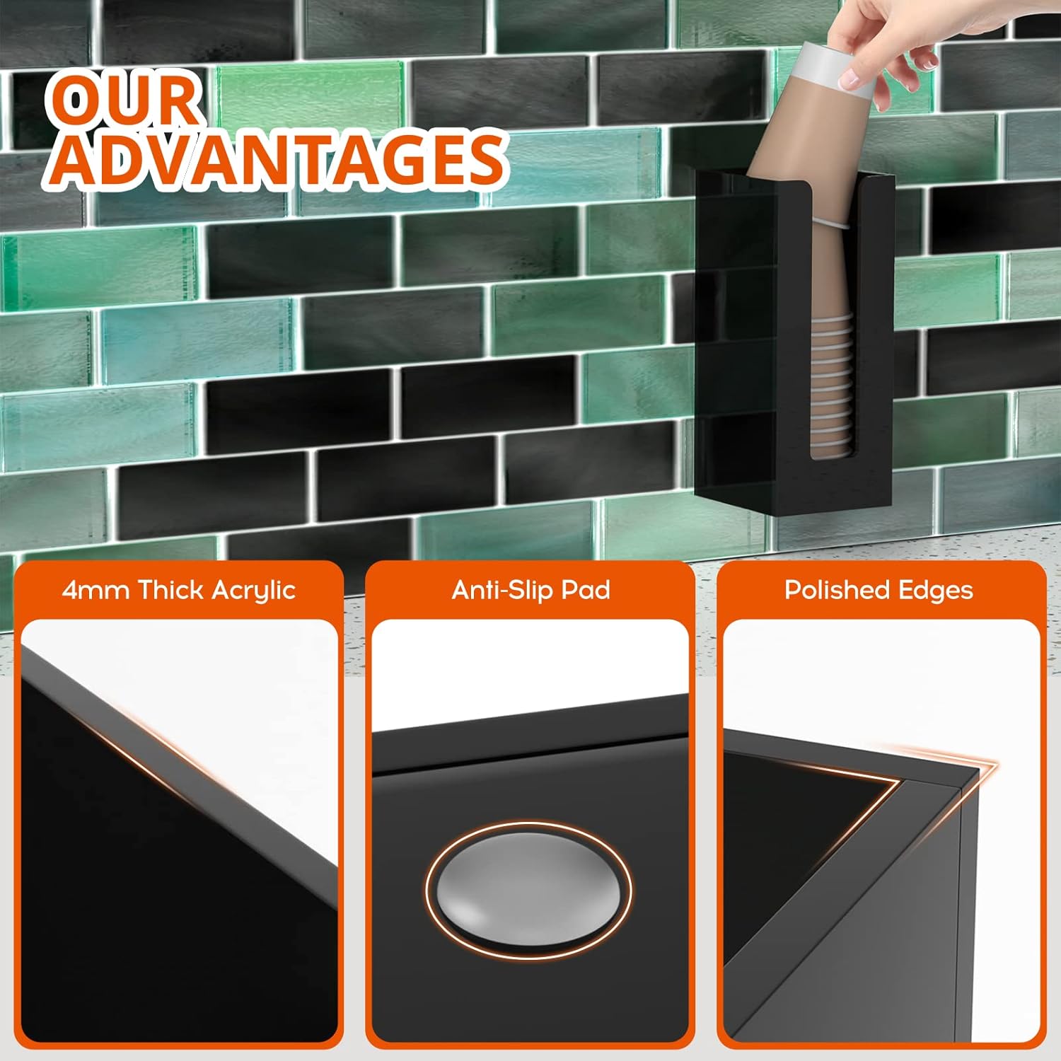 - Acrylic Coffee Lid Holder - made of 0.15"(4mm) thick acrylic, all the sides are polished and corners are rounded, better protect your fingers from getting nicked when taking out the disposable paper cups and lids, heavy and sturdy, modern and elegant to use with any decors.