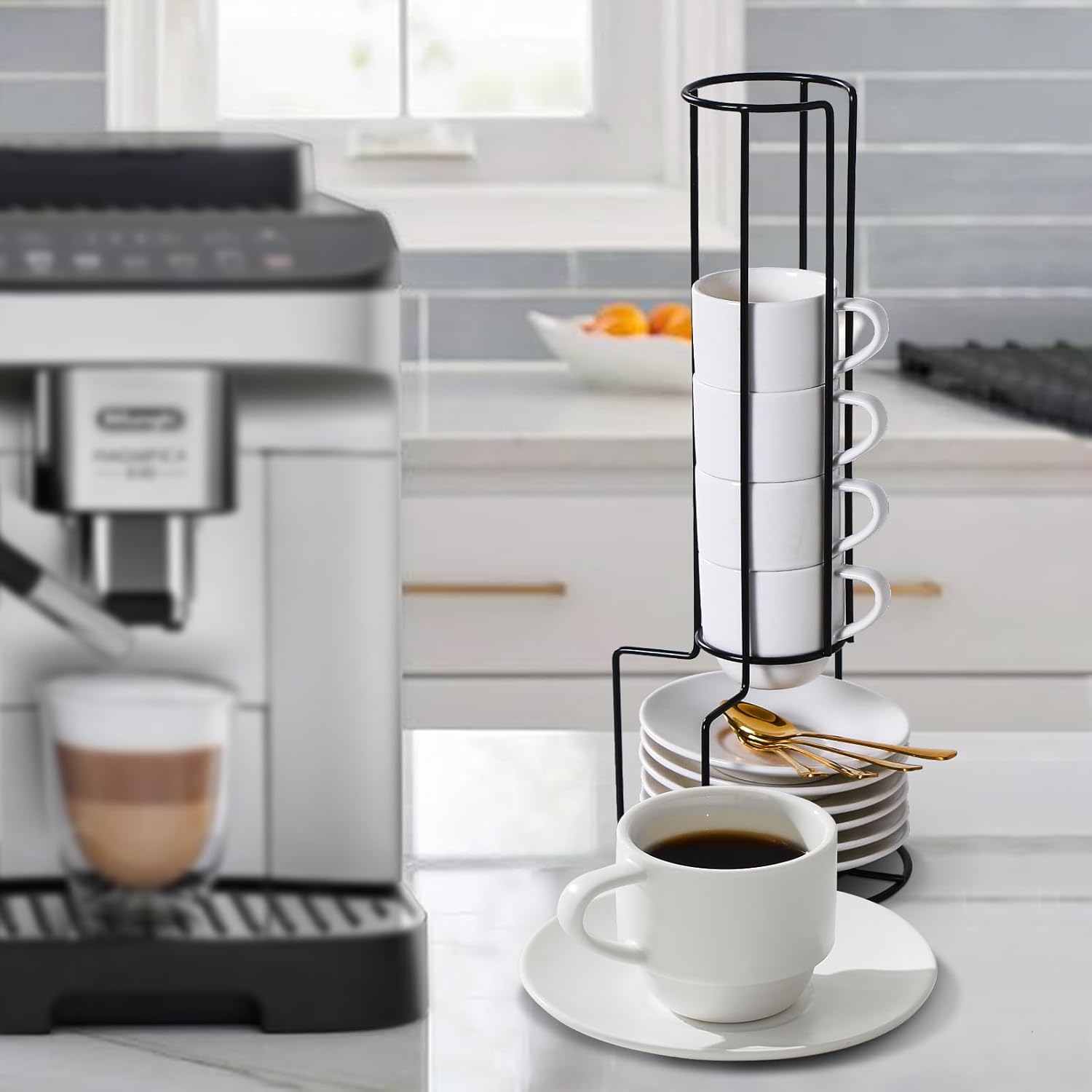 - Espresso Cups With Stand: Lareina espresso cups set of 6 with a bonus stacking rack to organize the cups and saucers after use. It helps greatly to get rid of the mess in your kitchen and keep it in a tidy and well-organized way. The stand makes moving the cups safer and easier