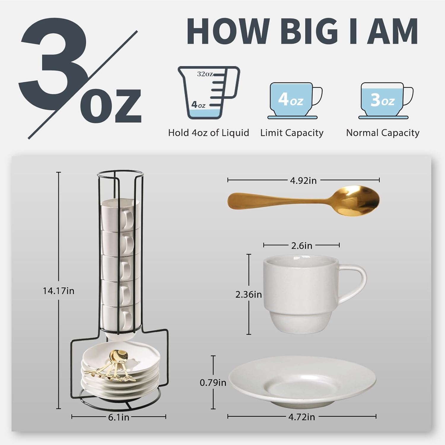 Lareina Porcelain Stackable Espresso Cups with Saucers, Spoons and Metal Stand, 3 Ounce Small Coffee Cups Set of 6 - Ceramic Demitasse Mugs, White